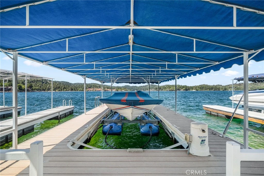 LAKEFRONT, lake view homes in Lake Arrowhead - One of a kind. Located in the palisades neighborhood, walk straight into this level entry 5 bedroom, 5 Bath custom home and get blown away by the lake views and overall orientation to lakefront living. The family area and primary suite features custom coffered ceilings, and expansive west facing views (exceptional at sunset). The home is immaculate, the exterior has a NEW roof, NEW exterior paint and the detail to the construction of the brand NEW deck is impressive. This home shows an extreme pride of ownership with every detail. The access to the dock couldn't be more perfect, nice easy path and takes you to your private lakeside patio with Single Slip Dock. The Dock amenities include, a hydro hoist under a nautical canopy, a large concrete patio for entertainment, side tie for guest and additional rear tie up, currently used for a Boston Whaler for easy convenient transportation to Restaurants, Bars, Loan Pine Island, Marina, and other Lake features. The Dock and Patio also include, a Dock House for all your sporting goods, exterior furnishings, and service area with refrigeration for beautiful afternoon entertainment for the entire family. This property is ready to enjoy. This property is viewed by appointment only. Dock Number : S333