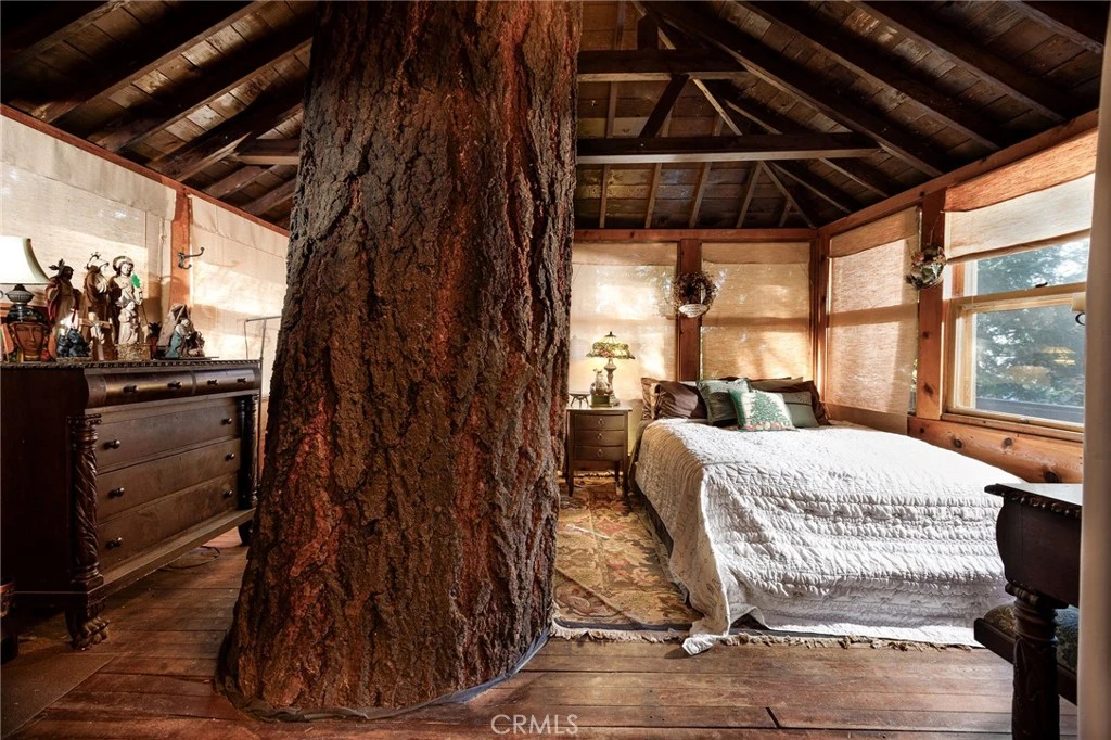 Calling the outdoors type looking for adventure in their mountain exploits! There's nothing like a towering white fir right in your bedroom to wake up with to make communing with nature a whole new experience! You've played as a kid in tree-houses, where the cabin was in the tree, right? Well this one has the tree IN the cabin! A true one-of a kind experience in this Christmas Cabin Treehouse. The second sleeping area is up the ladder to the loft. The bathroom comes with a sink and 1920s clawfoot tub enameled in cherry red, and the red touches continue into the kitchen with a red refrigerator, dishes and window trim. A Norwegian Jotul gas stove with crackling flames adds to the ambiance while heating the whole space very efficiently. A deck off the back of the house feels very secluded, surrounded by forest. There's a basement accessed from the deck stairs that has plenty of storage plus a washer and dryer. This cozy cabin is sold furnished, including some antiques, with just personals and a couple small things excluded, making your transition to cabin life so easy. While parking is tight, there is room to the right of the cabin to build a parking deck. Come on up to the pines (and firs) for some serious Glamping!