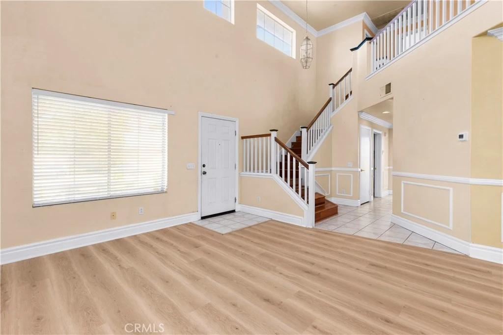 Welcome to this beautifully designed 4 bedroom, 3 bathroom home in the heart of Lake Elsinore. With a rare and versatile floor plan, you'll find 2 bedrooms and a full bath conveniently located downstairs, perfect for guests, multigenerational living, or a home office setup. The living room features a cozy gas fireplace and flows seamlessly into the main living area, creating a warm and functional space for everyday living and entertaining. Upstairs offers 2 additional bedrooms and 2 full baths, including a spacious primary suite complete with a private balcony. The primary bathroom features a walk-in-closet. Step outside to a covered patio and low-maintenance backyard designed for relaxation without upkeep.