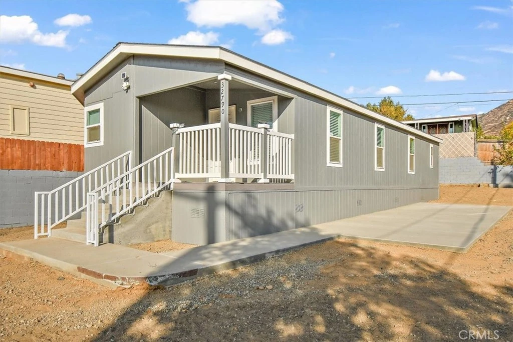 HUGE PRICE DECREASE!!! Welcome to this 2023 beautiful home featuring 2 bedrooms & 2 bathrooms with a bonus/optional 3rd bedroom with a total of 1100 Sq Ft of living area with a corner lot providing you a total of 8276 sq ft and surrounded by wood picket fence for extra privacy & RV parking plus a long driveway. The kitchen was beautifully remodeled featuring stainless-steel appliances. This home is manufactured on land with a permanent foundation. Step onto the front porch, a perfect space to relax and enjoy the beautiful mountain views. This move-in ready home is tastefully done with neutral color palette. Central air and heating. Private laundry room with access/side entrance door. Outside, the expansive lot offers endless possibilities. The side yard has a covered concrete patio slab to serve as an outdoor living area or car port. Side Access for additional parking. This home is ideally situated near the lake, motorsport racetrack and convenient access to the 15 freeway. Currently on septic but next year sewer is coming in owner just needs the signed paperwork with the water company. No HOA dues and low taxes and this home is eligible for financing! This is a MUST SEE.
