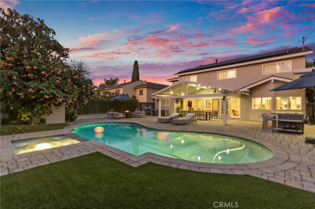 Extensively upgraded & move-in ready home with incredible yard. This beautifully designed home features a new roof (2015), full repipe, complete electrical rewire (2017), Milgard windows and doors, & solar panels with new electrical panel. The living room showcases a vaulted wood-paneled ceiling, designer Palecek beaded chandelier & a white brick fireplace with custom wood mantel. Updated white oak stairs with iron spindles. The remodeled kitchen offers white shaker cabinetry, quartz countertops with waterfall peninsula, a 36” GE gas range with custom zinc hood, Hudson Valley wall sconces, & a walk-in pantry plus an additional barn-door pantry for exceptional storage. The dining room includes a built-in dry bar with wine fridge, & Jeffrey Court backsplash. Additional living spaces include a downstairs flex room ideal for an office, gym, or playroom, and a spacious interior laundry room with extensive custom cabinetry, built-in bench with hooks, & quartz folding counters. The epoxy garage offers built-in storage cabinets. Upstairs features Coretec luxury vinyl plank flooring. The primary suite includes a private balcony with views of multiple fireworks displays, a remodeled bedroom with a custom California Closets walk-in closet. The primary bathroom, remodeled in 2023, showcases white shaker cabinetry, leathered quartz waterfall countertops, brass arched mirrors with Hudson Valley sconces, a large Calacatta tile shower with bench seating, and a private water closet with built-in storage. Secondary bedrooms feature California Closets organizers and ceiling fans, and the secondary bathroom has been remodeled with a double herringbone shower, quartz countertops, and recessed Kohler medicine cabinet. The entertainer’s backyard features Belgard pavers, an Alumawood gable patio cover with ceiling fans and recessed lighting, a fully equipped outdoor kitchen with 42” gas grill, sink, beverage fridge, storage, and bar seating, outdoor TV and Sonos sound system, a heated Pebble Tec pool and spa with new coping and waterline tile, mature avocado, lime, and lemon trees, drought-tolerant landscaping with turf, and a gated side dog run. HOA includes resort-like amenities including, a gym, pool, spa, and tennis, pickleball and other sports courts plus a walk in sand lagoon that was recently redone.