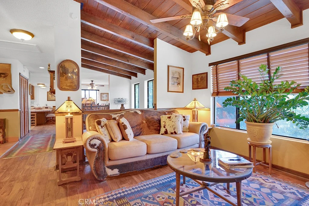 Discover this charming Lake Hughes view home! This beautiful 4-bedroom, 3-bathroom home spans nearly 2,300 square feet and features an open floor plan designed for comfort. Enjoy the convenience of RV parking, a 2-car attached garage, and ample outdoor space for boats and other toys. Inside, the spacious kitchen flows into a cozy living room, which opens to a fully fenced backyard perfect for relaxing or entertaining. The primary bedroom offers a serene retreat with its own private deck, where you can soak in stunning panoramic views of the surrounding nature. Upstairs, you'll find living room, formal dinning along with a unique entertainment room ideal for a home theater or lounging in a cabana-inspired style. With its eclectic design and recreational cabin vibes inspired by Tulum, this home is a gorgeous and one of a kind retreat.