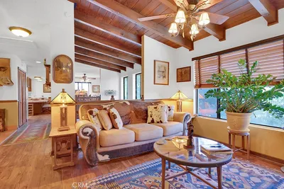 Set on a peaceful stretch of countryside, this custom Craftsman-style home offers privacy, space, and beautiful natural surroundings. Located at 28200 Pine Canyon Rd in Lake Hughes, the property features approximately 2,790 sq ft of living space with 3 bedrooms and 3 bathrooms, built in 2003 and set on about 28 acres of land. Surrounded by mature oak trees and backing directly to the Angeles National Forest, the setting provides wide views, abundant wildlife, and a true sense of quiet rural living. Inside, the home welcomes you with vaulted ceilings, hardwood floors, and detailed wood craftsmanship throughout. The spacious living room features a fireplace and large windows that bring in natural light and views of the surrounding hills. The open layout flows into a generous kitchen and dining area with custom Alder cabinetry, tile counters, and a large center island, creating a comfortable space for everyday living or entertaining. The home includes multiple gathering spaces, including a large den with its own fireplace and a private office, offering flexibility for work or relaxation. The primary suite features a cozy fireplace, dual walk-in closets, and a spacious bathroom with a soaking tub, separate shower, skylight, and dual sinks. Additional bedrooms share a Jack-and-Jill bathroom, making the layout practical for family or guests. A wrap-around covered porch invites you to enjoy the surrounding landscape and peaceful outdoor setting. The property also includes an RV pad and plenty of usable land, with space for horses, a barn, workshop, or other future improvements. With its combination of custom construction, scenic surroundings, and expansive land, this property offers a unique opportunity for buyers seeking privacy, nature, and room to create their ideal lifestyle.