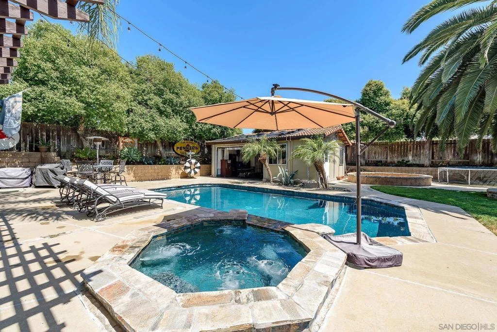 Welcome to this beautifully upgraded 4-bedroom, 2.5-bath home in the highly desirable Jennings Vista neighborhood of Lakeside! This turnkey property blends charm, comfort, and convenience—perfect for families and entertainers alike. Enjoy the ultimate backyard oasis featuring a sparkling pool, Jacuzzi, and an oversized Pool House ideal for outdoor toys, storage, or extra hangout space. The spacious lot includes stamped concrete, side gates, and ample room for RVs or campers. Inside, you'll find vaulted ceilings, custom interior paint, and tastefully upgraded kitchen and bathrooms that bring personality and modern flair. The primary suite offers a private balcony with backyard views and a generous walk-in closet. Upgrades include a new deck, roof, HVAC, windows, Whole house fan, smart switches and more—ensuring long-term peace of mind. The property also features leased solar for energy efficiency. Located in a welcoming neighborhood great for families.