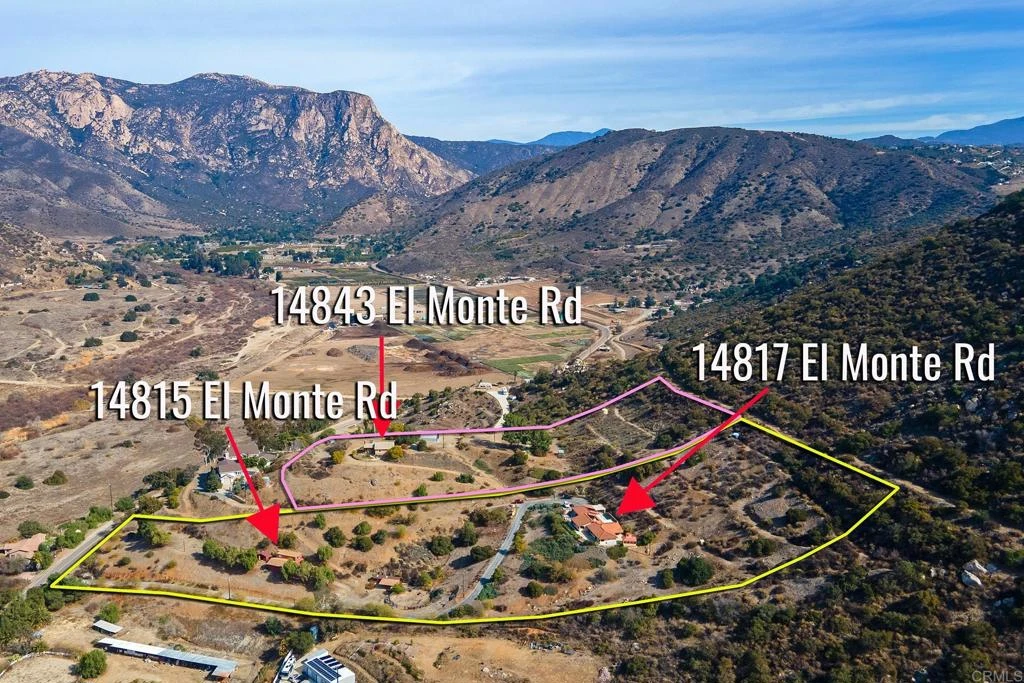 Prideful 11.05 ac estate with stunning views located near El Monte Park. Horse lovers, contractors etc.. You have found paradise!! Your investment inc. (2) legal adjacent parcels comprising of (3) permitted residences and a 40'X30' permitted enclosed workshop (approx. size) In all, a total of 6BR/4.5 BA and 4213 sqft (sqft does not include workshop). Details of parcel #393-033-16- addresses 14817 & 14815 totaling 6.46 ac. The primary home is a custom 1 story 3/2 w/large 2-car garage. Beautiful views from all rooms, featuring: In-ground elaborate lap pool w/ water features, water softner & purifying system, recessed lighting, ceiling fans, executive style master suite, spacious laundry room. Truly an open floor plan w/wrap around fireplace. (approx 2400sqft). Detached separate 1Bd/1Ba unit w/ living room, kitchen & shower (approzx 500sqft) This parcel also provides an additional non-permitted studio w/shower. Details of parcel #393-011-06 address 14843 totaling 4.59 ac. Custom 2BD/1BA home featuring a living room,kitchen & basement totaling 1290 sqft VIEWS! Awesome 40'X30" approx enclosed workshop permitted w/power. This parcel inc. "The Campground", a massive level pad w/power & water. Ideal for parties and RV stay overs! VIEWS! Additional estate details- Horse trails, corral with shelter/2 stables and turn-out. 2 additional corrals, arena & ring. Productive 6-8 GPM(approx) well w/ 3 storage tanks. Efficient rainwater capture system that holds over 1000 gallons, Storage tank on top of hill. Tons of on-site parking. Hiking trails nearby from Lake Jennings to El Monte Park. Estate has (2) legal access locations off El Monte Rd for ingress & egress. Also, Hiking & riding trails from Lake Jennings to El Monte Park. Agents, This Ponderosa estate is a tremendous opportunity for your East County buyers!!