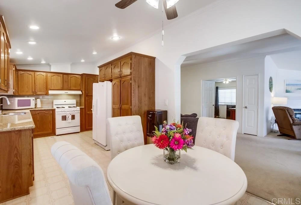 Pride of ownership shines in this beautifully upgraded home located in the highly sought-after 55+ gated community of Lake Jennings Park Estates. This spacious home features a large primary bedroom with a walk-in closet and attached bath offering dual sinks, a walk-in shower an additional exterior door that leads to the spacious out door area. The living room includes an electric fireplace and great windows for plenty of light. Not to forgot the well-appointed kitchen offering granite countertops, abundant cabinetry, recessed lighting and a sit-down eating area surrounded by windows. The dining room offers a large entertaining area and a built-in hutch. The bonus room is being used as an office and offers extra room for a guest bed. Upgrades include newer HVAC, ceiling fans and plenty of storage throughout. Enjoy a private backyard oasis with low-maintenance landscaping, artificial turf, colorful plants, fruit trees, multiple sitting areas and a covered patio perfect for relaxing or entertaining. The extended carport provides ample parking along with a large storage shed. Lake Jennings Park Estates offers land ownership (no space rent), a clubhouse, heated pool and spa, game room with two billiard tables and multiple card tables, fitness center, pickleball court, library, RV parking, walking paths, and stunning Lake Jennings' views. Conveniently located near shopping, dining, medical offices and freeway access. Low monthly HOA dues of $213. Move-in ready and located in one of East County's most desirable gated senior communities—don’t miss this opportunity!