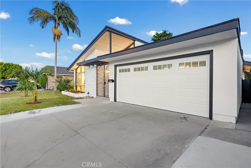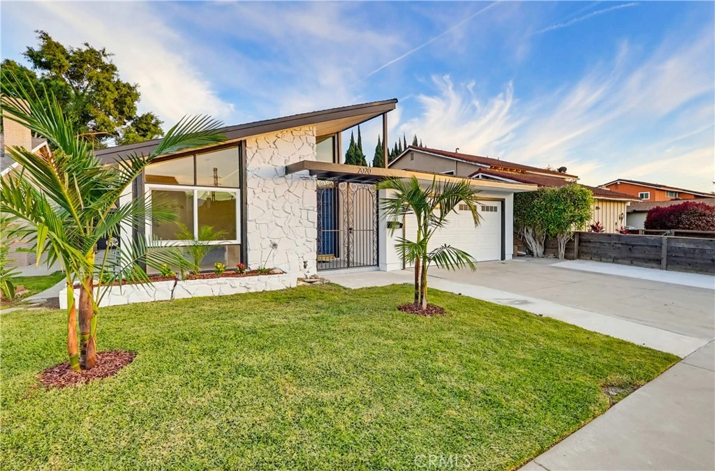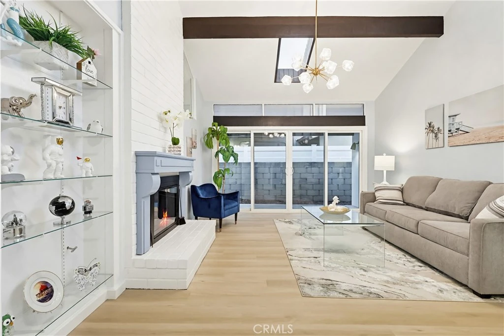 Open-concept living space featuring soaring vaulted ceilings accented by exposed wood beams sets the tone for this stunning 4-bedroom, 3-bathroom Pool home in the highly desirable Cherry Grove neighborhood of Lakewood Mutuals. Designed with a subtle mid-century modern influence, the home welcomes you through a gated front courtyard into a private foyer and showcases abundant natural light from skylights and expansive windows, along with a statement fireplace anchoring the main living area. The functional layout includes two primary bedrooms, offering flexibility and comfort. The fully remodeled kitchen features custom soft-close white shaker cabinetry, quartz countertops, a glass tile backsplash, and stainless steel appliances. All three bathrooms have been tastefully updated with contemporary finishes, including modern tile work, white shaker vanities, and LED mirrors. Recent upgrades include new dual-pane windows and patio doors, waterproof vinyl and tile flooring throughout, a brand-new ducted HVAC system, recessed lighting, fresh interior and exterior paint, updated drywall, and epoxy flooring in the garage. The home also faces north, providing balanced natural light throughout the day. The resort-style backyard is designed for year-round enjoyment, complete with a sparkling pool, cabana, pergola, and built-in BBQ area—ideal for entertaining. Conveniently located near parks, schools, shopping, dining, and freeway access, this move-in-ready home offers the perfect blend of style, comfort, and functionality.