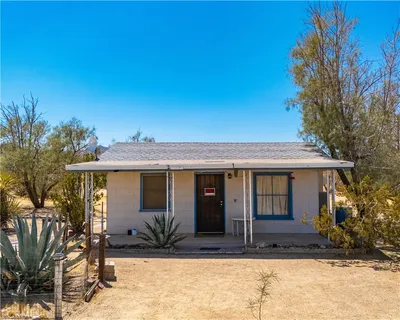 Welcome to your desert oasis! This fenced acreage property in Landers offers the perfect blend of tranquility and convenience, an ideally situated SINGLE FAMILY HOME near the iconic Integratron, La Copine, Giant Rock Meeting Room and Gubler Orchids, celebrated for their famous Orchid Festival. Enjoy sweeping views of Goat Mountain from your living room, or step outside and enjoy the shade from the mature eucalyptus and pine trees, or admire the vibrant agave that are dotted around the home. The oversized, partially covered concrete patio invites you to unwind and take in stunning desert sunsets and the brilliance of dark night skies. Inside, the cabin features newer carpet, one bedroom with ample closet space, and one bath. A handy storage shed adds practicality to this charming retreat. Centrally located, you’re just 30 minutes from the breathtaking landscapes of Joshua Tree National Park and one hour from the slopes of Big Bear or the lively resort life of Palm Springs. This property is a blank canvas, ready for you to add your personal touches and make it your own. Don’t miss this incredible opportunity to create your dream desert getaway!