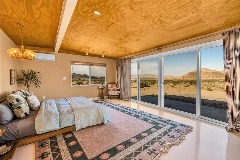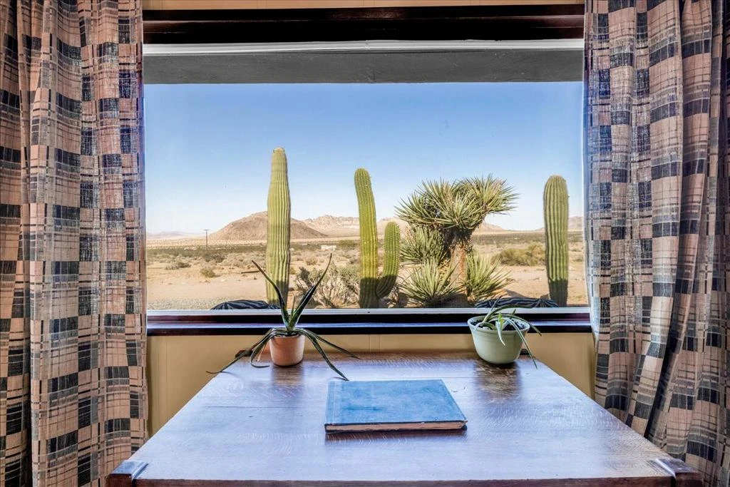 Unobstructed mountain views in every direction. This is the perfect blend of mid-century style and modern desert living in this beautifully updated 3-bedroom, 2-bath high desert retreat. Set in a serene and scenic location near Goat Mountain and the iconic Integratron sound bath, this home offers comfort, character and incredible natural surroundings. Complete renovation includes butcher block kitchen countertops, custom cabinetry, newer top-of-the-line appliances, smooth finished epoxy floors along with all new energy efficient dual pane windows and doors. Natural light , open floor plan and vaulted custom wood ceilings. Extra large primary bedroom suite with stunning bathroom and separate laundry closet. All bedrooms and living room offer split AC units for individual room temperature control. Outside you'll find an amazing mature cactus garden, firepit, horse shoe pit and separate small guest room, office or art/music room. Home is shaded by mature Tamarisk trees to the West. Private hot tub for relaxing under the stars. 5 acre lot with 2.5 acres completely fenced, gives the feeling of being off the grid with all the luxuries of utilities in place and hidden from views. Yucca Valley, Joshua Tree Park, Pappy & Harriet's, Integratron, La Copine restaurant are all close by.
