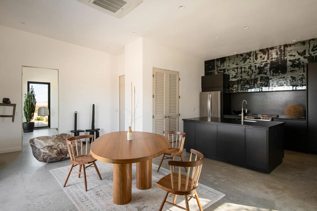 The Goat Mountain HouseA 2024 architectural desert compound set against the raw beauty of the Mojave.Welcome to The Goat Mountain House, a contemporary, design-forward retreat conceived for those who value architecture as art. Completed in 2024, this modern minimalist compound comprises two sculptural volumes: a striking main residence and a generous guest house, each thoughtfully positioned to harmonize with the surrounding landscape and capture the quiet grandeur of Goat Mountain.The main house features clean lines, smooth stucco walls, and soaring ceilings that create a sense of calm and openness. Floor-to-ceiling glass frames expansive High Desert views, flooding the interior with natural light and connecting every space to the rugged beauty outside. A refined kitchen with a large island anchors the open-concept layout, flanked by two serene bedrooms and a spa-like bath.A west-facing covered patio extends the living area outdoors, ideal for al fresco dining beneath endless desert skies. Between the two structures, a mature olive tree offers a sculptural focal point and anchors the flow of the compound.The guest house mirrors the home's aesthetic with its own living area, kitchenette, two bedrooms, and a beautifully finished bath. Outside, a wood-paneled hot tub and private patio create a perfect vantage point for stargazing or quiet morning coffee.Set in one of the most desirable pockets of the desert, the property offers rare tranquility, sweeping panoramic views, and a feeling of total serenity, all just minutes from Joshua Tree National Park, La Copine, the Integratron, and the shops and dining of Pioneertown and Yucca Valley.Custom planter boxes with sculptural cacti and a bespoke stone fire feature complete the setting, an intentional blend of restraint and warmth.More than a home, The Goat Mountain House is a living composition, an architectural retreat that functions beautifully as a full-time residence, a second home, or a design-forward short-term rental investment. It embodies the essence of the High Desert with expansive views, inspired design, and absolute quiet.