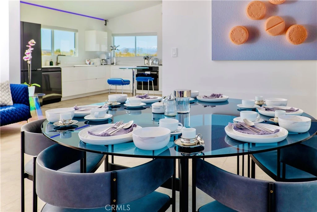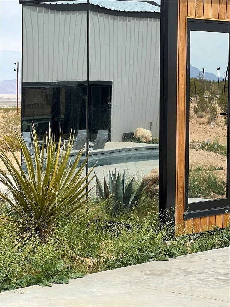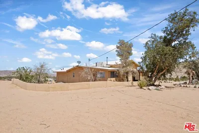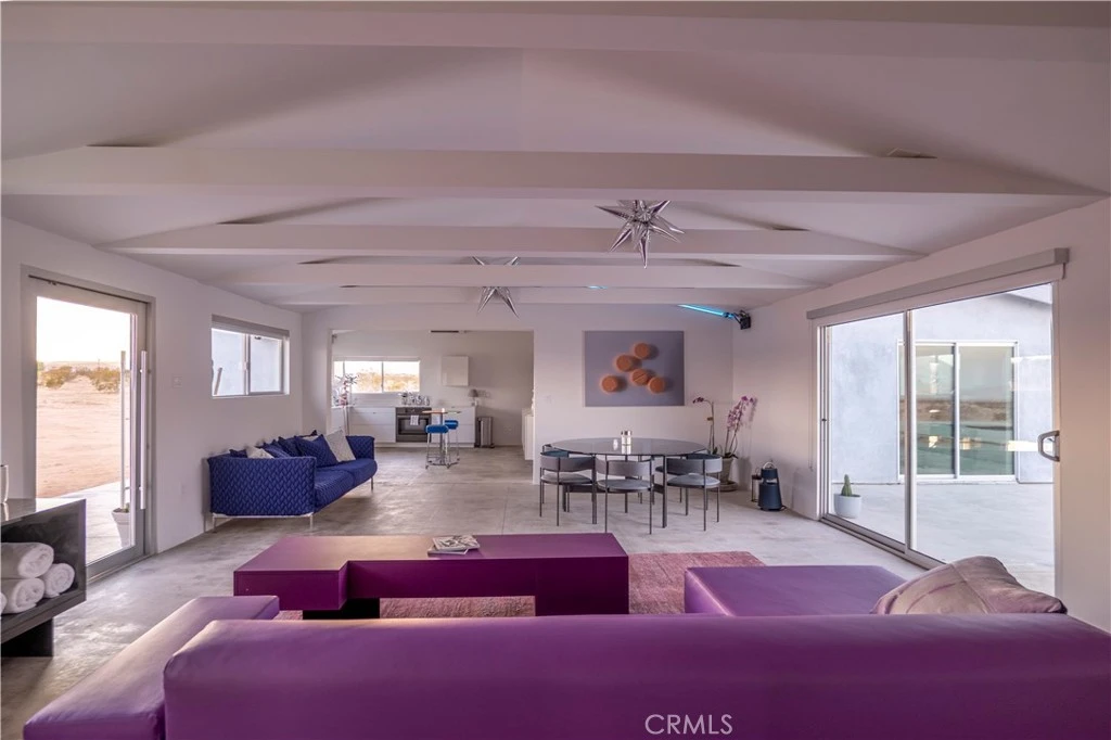 Set within the exclusive high-end Landers corridor and surrounded by pristine BLM land, this breathtaking 10-acre retreat is the sister property to the world-famous Invisible House. Designed by Christopher Hanley—visionary film producer (American Psycho) and internationally recognized creator of iconic architectural works—and with interiors by Roberta Hanley, this home is a fusion of cinematic design, desert beauty, and wellness-driven living. Just minutes from La Copine, Pioneertown, and the Joshua Tree National Park entrance, this property is ideally situated for both solitude and accessibility. A packed sand road leads you to this secluded estate, where stunning views of Goat Mountain and vast desert skies create an unforgettable backdrop. The main residence offers 2,300 square feet of fully permitted living space, blending sculptural lines with panoramic windows that frame the ever-changing desert light. Inside, slate-finished luxury bathrooms, multiple sleeping alcoves, and open-concept living areas invite relaxation and connection. A mirrored sauna and two reflective domes by OOD Designs provide peaceful spaces for yoga, meditation, or massage. Anchoring the property is a fully permitted 4,500-square-foot residential accessory building, constructed with a steel frame and soaring 21-foot ceilings (dimensions 50x90 ft). Hidden discreetly from view, this expansive structure is ideal for hosting private events, creative production, or a dynamic retreat experience. Two 250-square-foot modular units offer additional flexibility for guest accommodations, studios, or wellness spaces. Outside, a 100-foot pool and spa mirror the desert glow by day and the stars by night—offering a meditative, unforgettable experience. The estate includes two legal 5-acre parcels and is zoned to allow for an additional main residence and two ADUs or guest houses, offering rare potential for expansion. Bitcoin accepted. A modern masterpiece where architecture, art, and nature converge—crafted by the creators of one of the most iconic homes in the world.
