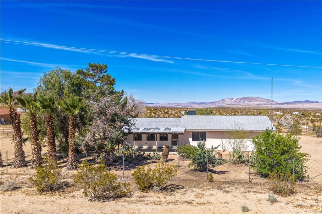 Affordable, fully remodeled 3-bedroom, 1-bath home on 4.5 acres in Landers, offering space, upgrades, and beautiful desert surroundings. This property features mature desert landscaping with large palm trees, along with approximately one acre fully fenced, providing a great balance of open land and secure usable space. Additional highlights include an attached two-car garage—a rare feature for the area—along with a new central HVAC system and a new electrical panel. As you arrive, you’ll appreciate the flat, usable acreage and peaceful setting. Inside, the home welcomes you with tongue-and-groove ceilings and exposed wood beams that add warmth and character throughout. The brand-new kitchen features new cabinetry, quartz countertops, a black stainless steel sink, and new stainless steel appliances, offering both style and functionality. The home flows seamlessly into the spacious living room, complete with an electric fireplace and a large bank of windows that bring in natural light and showcase the surrounding desert landscape. The primary bedroom is a standout, featuring a wood-burning fireplace with tile surround, recessed lighting, and beautiful wood beam ceilings. The second bedroom is similar in size and also features wood beam ceilings and views of the front yard, while the third bedroom is comfortably sized and shares those same views. The bathroom has been fully updated with a new vanity, toilet, mirrors, lighting, and a walk-in corner shower. Step outside to enjoy the large front patio with skylights, creating the perfect setting to relax and take in the desert evenings. At the rear of the property, you’ll find an additional outbuilding with laundry hookups, adding convenience and functionality. With extensive upgrades already completed, this home is move-in ready and offers an excellent opportunity to enjoy desert living with space, privacy, and modern finishes. Homes like this go quickly—schedule your showing today before it’s gone.