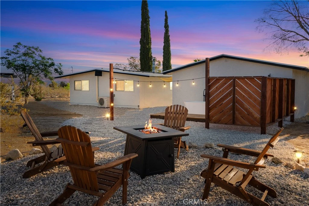 Escape to your own serene sanctuary with this tranquil, private 2.5-acre Desert Retreat, fully fenced and thoughtfully designed for peaceful living or a weekend getaway. This carefully maintained and recently updated 2-bedroom, 1-bath home features durable, wood-look vinyl flooring and a well-equipped kitchen with a spacious island—perfect for cooking or entertaining. Offered fully furnished with all the amenities - organic hybrid memory foam latex mattresses, and stylish furnishings (all less than two years old), this home is move-in ready the moment you close. Stay comfortable year-round with recently installed efficient mini splits for both heating and cooling. Step outside and discover even more to love: a large detached garage that holds exciting potential for an art studio or guest house conversion, an inviting pergola for shaded outdoor dining, a cozy firepit area, and mature desert landscaping serviced by brand new permitted grey water system. Indulge in a soak in the outdoor freestanding tub, privately nestled on a wooden deck and perfectly positioned to take in star-filled night skies. Wake up to stunning views of Goat Mountain from the front porch, shower under the open sky, or unwind in the swing chair and hammocks. A vibrant mural adds a creative touch to the garage exterior, and the entire space is made for relaxing, recharging, and embracing desert beauty. Just five minutes from Giant Rock, Goat Mountain, the Integratron, and the beloved La Copine, and only 15 minutes to Joshua Tree National Park—this special property is a true desert gem.