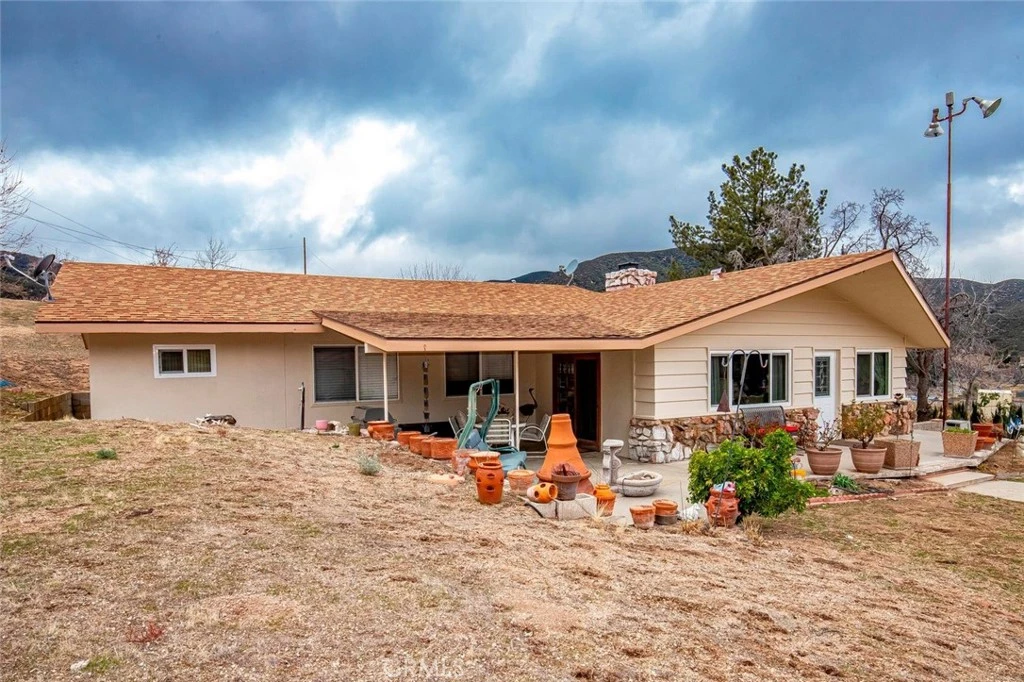 COUNTRY LIVING AT ITS BEST ON OVER 12.6 ACRES IN LOVELY LEONA VALLEY! This great home was just completely painted on the outside. The Living Room is spacious and features a Rock Fireplace with a Raised Hearth to keep you warm on cold winter nights. There are French Doors to the Patio and an Open Beam Wood Ceiling to add warmth to the space. The Tile Flooring (throughout the house) is durable and easy to care for. The Kitchen features Lots of Custom Cabinets with Tile Countertops. The Master Bedroom is roomy and has Crown Molding as well as a good sized closet. The attached Master Bathroom was recently remodeled with Dual Sinks, New Cabinets, Quartz Countertops and an Oversized Shower with Contemporary Custom Tile, Stone Look Floor and Glass Surround. The second bath was also Beautifully Remodeled. The seller is currently using the 3rd bedroom as a Family Room but it can easily be converted back to 3rd and even can be 4th bedroom added. There are Ceiling Fans and a Cozy Wood Stove in this space. The Indoor Laundry Room is Spacious and has cabinets. There are Dual Pane Windows throughout the house. The Doors were all also replaced. The Heat and Air Conditioning was replaced about 5 years ago. Outside is great for the family, kids and animals. The covered Patio is great for family BBQs or just enjoying the View. There is a Horse Barn -- 40 X 45 foot, 5 Stall plus Tack Room which also has a loft upstairs. It is a great spot for a playroom or a workshop. The property is ready for your Garden with Raised Beds, Potting and Grow Sheds (some were used for Hydroponic gardening). There are Fruit Trees, Walnut Trees and Grape Vines. There is an oversized 3 Car Garage with paved driveway in front. The property is gated in the front for added privacy. The aerial map attached shows how large this property is. It included 2 Legal Parcels. Don't miss this Great Home and Great Property.