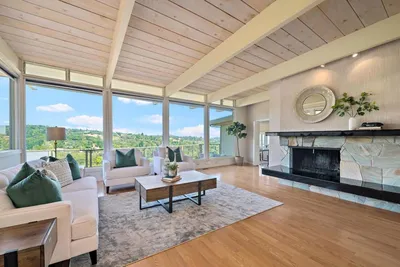 A whole-home renovation has transformed this European-inspired contemporary residence on approx. 1.49 acres with landscaped grounds and multiple outdoor entertaining areas. The home offers 6 bedrooms, 3.5 baths, a finished loft, and a detached studio, plus an iconic kitchen/family great room and dedicated housekeeping room. Imported Finnish oak floors, hand-troweled plaster walls, and vaulted ceilings highlight refined craftsmanship throughout. The open kitchen features high-end Finnish cabinetry, honed quartz counters, striking full-height tile, two islands, a wine cooler, and Wolf/Subzero appliances. A housekeeping room doubles as a prep kitchen for events. The adjoining family room includes a contemporary fireplace, retractable glass doors, and concealed 120-inch screen with 5.1 surround sound. The primary suite offers a Danish gas fireplace, spa-like bath, and large walk-in closet. Four additional bedrooms on the lower level open to the outdoors for easy pool and garden access. Outdoor spaces include a beach-shelf pool, elevated spa, fire pit terrace, and a gazebo with Bay views. The home has comfortably hosted 120+ guest events. Modern amenities include Control4 automation, extensive audio, security systems, and a 4-car garage with two Tesla chargers.