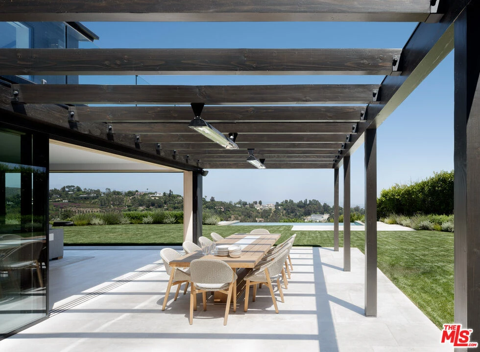 Sited on one of Bel Air's most coveted ridgelines, the residence is a masterfully reimagined estate by Ballantine Studio, set on approximately 1.5 acres with sweeping hillside-to-coastal views. The striking two-story home spans 6,400 sq ft, offering 7 en-suite bedrooms and 7 bathrooms, thoughtfully arranged across two wings with a private primary suite and separate guest/office lounge. Designed for seamless indoor-outdoor living, the open floor plan is anchored by warm white Venetian plaster walls and 10" wide-plank European white oak flooring, with expansive Fleetwood glass framing the surrounding vistas. Vaulted ceilings with custom wood beams define the upper level, while a dramatic skybridge overlooks the double-height living room, accessed via a sculptural open-rise staircase enclosed in glass. Refined finishes include curated marble, chef-grade appliances, Arto Norman brick, Baldwin Estate Collection hardware, and precision-crafted millwork with integrated reglet detailing. Bespoke KGM lighting design highlights cove, bridge, stair, and running board illumination throughout. Fully integrated Crestron smart home system controls lighting, audio/visual, HVAC, security, pool, and access, complemented by 24/7 monitored perimeter cameras and speaker system. Additional features include linear HVAC venting, concealed shade pocketing, custom closets and built-ins throughout, and a private gym. Thoughtfully designed with fire-resistant materials and surrounded by water-retentive, fire-conscious landscaping, offering a rare combination of architectural pedigree, privacy, and long-term livability in Bel Air.