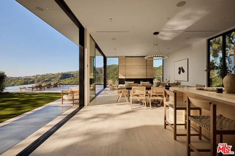 The Glassridge Residence. A Tadao Ando inspired organic modern with walls of glass that open to ocean and Getty views. Privately gated and set along one of Bel Air's most prominent ridgelines, the estate was newly completed in 2025 by Studio MD - AIA, with interiors by James Rosen. The main level is conceived as an open-plan environment with soaring 12' ceilings and sliding glass walls that connect living, dining, and kitchen spaces directly to the surrounding landscape. The kitchen reads like a gallery installation, featuring full-height travertine surfaces, a 15' waterfall island, and seamless, handle-less cabinetry that conceals an integrated Miele appliance suite, including double ovens and a built-in espresso machine. On the top level, a private vestibule with a stone-clad prep bar, integrated sink, and refrigerator precedes the primary suite, creating a quiet transition before the view reveals itself. Designed to honor its breathtaking setting, the bedroom is lined with floor-to-ceiling sliding glass walls that open to a wraparound private terrace, extending the suite outdoors and framing uninterrupted hillside and ocean views. The en-suite bath is resort-caliber, finished in travertine with a freestanding soaking tub, walk-in shower, and custom double floating vanities. A linear skylight draws natural light into the space, while a custom walk-in closet sits adjacent, integrated with matching wood millwork. The lower level is organized as a sequence of architectural moments featuring a linear corridor set against an exposed board-formed concrete wall, left intentionally raw, accented by wide-plank oak flooring. This level includes a private three-tier theater, temperature-controlled wine room, gym and steam shower, bar and lounge area that opens to a separate outdoor deck, all designed as a self-contained environment for leisure, wellness, and entertaining. A fully integrated Control4 system manages lighting, climate, audio, and security. The backyard showcases a 41' infinity pool that visually disappears into the landscape, flowing into a waterfall feature visible from the lower deck below. Lounge areas, dining zones, a built-in Alfa wood-fired pizza oven, grill, and a level lawn are arranged as distinct outdoor settings, all oriented toward the surrounding hills. 1149 Linda Flora Drive stands apart as an architecturally distinguished estate thoughtfully designed for privacy and wellness.