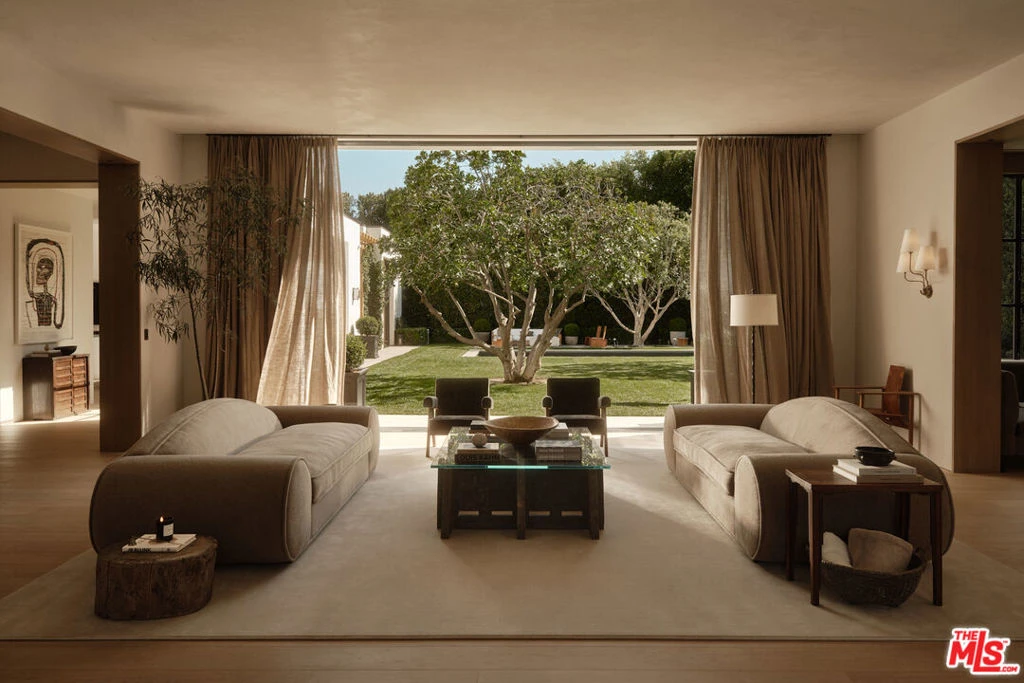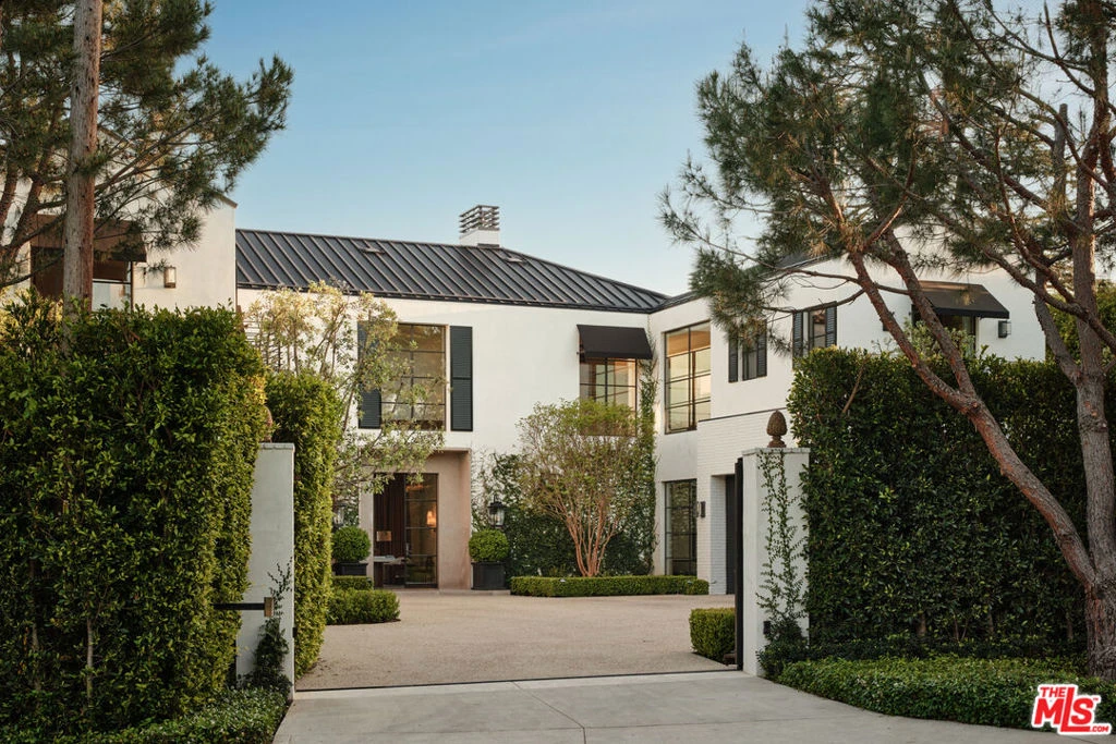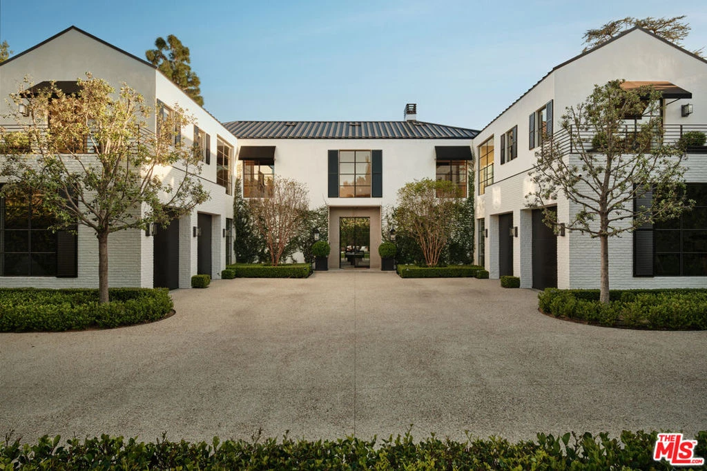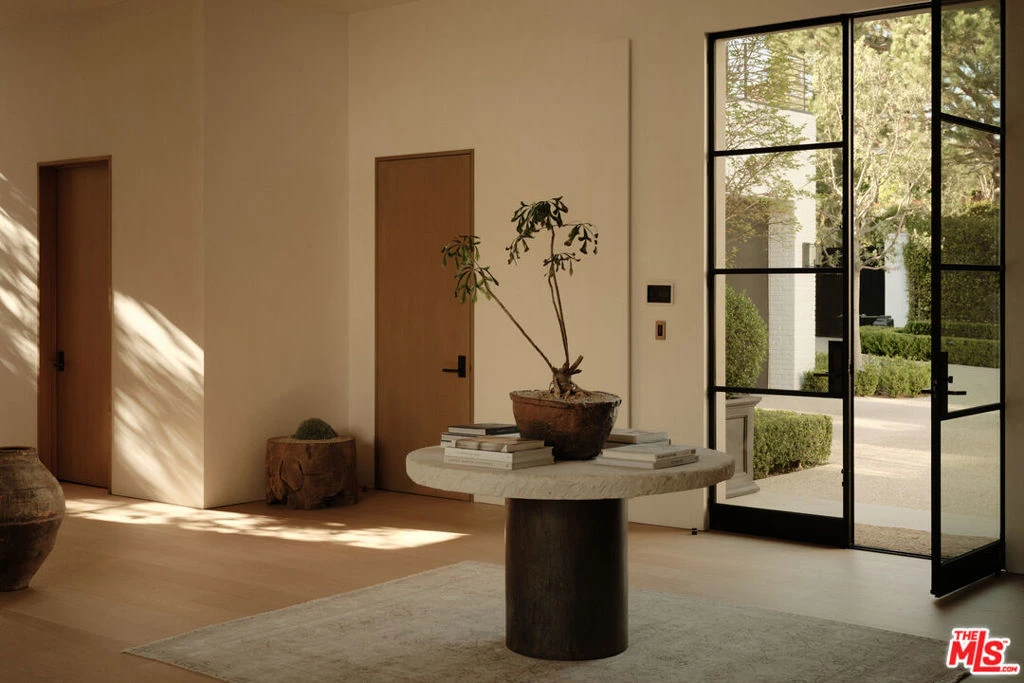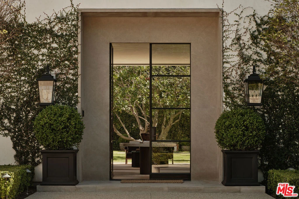 A rare offering in Brentwood Park, this newly completed warm traditional estate is defined by a quiet, understated luxury - where timeless architecture meets a serene, organic sensibility inspired by the calm of Aman and the raw materiality of Axel Vervoordt. Completed after a meticulous five-year design and construction process, the home reflects an exceptional level of craftsmanship and precision. Hand-applied plaster walls, custom steel doors and windows - including expansive pocketing panels that disappear into the walls - and wide-plank natural oak floors establish a cohesive, textural palette. Generous proportions, soaring ceilings, and carefully composed sightlines allow natural light to move effortlessly throughout. Designed for both daily living and elevated entertaining, the main living spaces unfold along a central axis anchored by a series of aligned fireplaces, creating continuity and warmth throughout. A dramatic yet inviting living room, formal dining room, and a 16-foot great room flow seamlessly into a fully equipped gourmet kitchen with separate chef's kitchen. A paneled library/office with bar, Dolby Atmos theater, game room, wine cellar, elevator, and a fully realized gym, spa, and wellness retreat complete the offering. The primary suite is a true retreat, opening to an expansive terrace overlooking resort-like grounds with a striking pool, generous lawn, courtyard gardens, and an outdoor dining room beneath a covered loggia. Dual spa-like baths and custom closets complete the suite. Secondary bedrooms are all en-suite, with walk-in closets and refined stone and marble finishes. Privately set behind gates and mature hedging on one of Brentwood Park's most desirable streets, the estate offers a seamless balance of architectural integrity, comfort, and modern living.