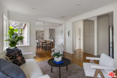 In Silver Lake, this spacious Traditional is a serene find with a scenic yard beneath a majestic oak tree. Artful landscaping sets the scene for morning coffee on the front porch; light filters through the oak canopy into the free-flowing living spaces, with hardwood floors throughout. The updated kitchen features tasteful grey cabinetry, stainless appliances, and generous storage. Three bedrooms include a primary with skylights, and the versatile third bedroom that can serve as a den or office. The bonus space under the home has a private entrance, kitchen, and bathroom, perfect for guests or creative studio. The private terraced backyard feels like a woodland escape for dining al fresco and relaxing. Amenities include AC, laundry, and garage with storage. The great location puts you moments from Edendale, Forage, Silver Lake Wine, Trader Joe's, and everything you love in Silver Lake.