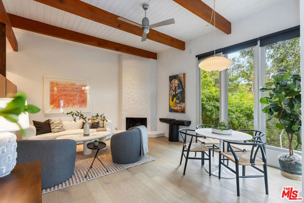 Private c.1965 Modern View residence with pool above the gates in Beachwood Canyon. 2 beds/2.5 baths plus a dedicated office. Framed by mature eucalyptus trees, this serene, light filled retreat offers sweeping canyon views from nearly every room. Fresh from a thoughtful renovation, newer 60s-inspired finishes blend brilliantly with modern materials. European oak floors and mid-century built-ins throughout. Fleetwood windows and doors open for seamless indoor/outdoor access. Living and dining areas flow into the chef's kitchen with Wolf range, Sub-Zero fridge, and wine chiller. The luxurious primary offers direct Hollywood Sign views, a spa bath and an expansive walk-in closet. Additional spaces include an inviting den/screening room and a guest suite on the lower level. Out back, feel like you're on permanent vacation in your own secluded, lush tropical oasis with deck-integrated pool, spa and outdoor shower illuminated by ambient string lighting. Secure gated front entry and direct access garage with Tesla charger. Griffith Park hiking trails, Lake Hollywood and Beachwood Village are steps outside your door. This concealed canyon compound is an idyllic natural hideaway just under the Hollywood sign with commanding canyon vistas and true Hollywoodland hillside privacy.