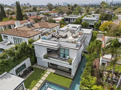 Introducing 538 N. Alta Vista Blvd, a striking modern estate in the heart of Beverly Grove. Privately positioned behind dual gates, this 5-bedroom, 6-bathroom residence offers approximately 4,700 square feet across the main home and guest house/ADU, blending architectural sophistication with true resort-style living. A dramatic 10-foot pivot glass entry opens to a grand foyer and floating glass staircase, while expansive Fleetwood pocket doors, Venetian plaster walls, and designer finishes elevate the home throughout. The chef’s kitchen features backlit Italian cabinetry, Carrara marble waterfall countertops, and top-of-the-line Miele PureLine appliances including dual ovens, espresso station, and integrated refrigeration. The soaring living room with a see-through fireplace opens to a spectacular backyard with a 70-foot saltwater lap pool, dual spas, grilling lounge, turf areas, covered cabana, and detached ADU/yoga studio. Upstairs includes three junior suites, a spacious laundry room, and a luxurious primary retreat with wraparound balcony, oversized custom closet, linear fireplace, and spa-like bath with steam shower, soaking tub, dual Italian vanities, and Graff fixtures. The rooftop deck is an entertainer’s dream with wet bar, refrigeration, fire pit, surround sound, and iconic Hollywood Sign views. Complete with Control4 smart home functionality, Denon Pro audio, and 4K live-streaming security. Furnishings and artwork available upon request.