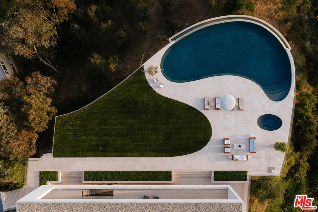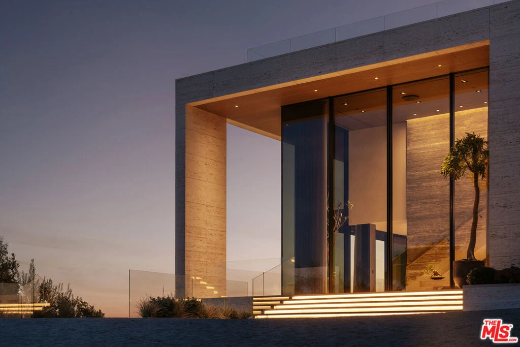 Sempre Vista. Representing one of the most compelling offerings in Los Angeles' luxury market in years. With over 12,500 square feet of Thomas Juul-Hansen architecture on 2 private acres in prime Brentwood. Juul-Hansen, the Danish architect, designed Sempre Vista as a monumental rectangular frame clad in sandblasted Alabastrino travertine, a finish chosen for its depth, warmth, and the way it holds light across the face of the building. Executed by Roderick Builders with the precision the design demanded, nearly 19-foot seamless motorized glass panels dissolve every wall, and the columns recede so completely at the lower level that the entire structure appears to float above the hillside. The views run coast to canyon, ocean to skyline, without a single interruption. Six bedroom suites, ten baths, elevator, double-height formal living room and foyer, Gaggenau kitchen with two oversized islands and custom oak cabinetry with recessed brass hardware, glass-enclosed temperature-controlled wine cellar, three-tier theater, massage room, sauna with a dedicated view window, gym, Gessi fixtures throughout, Cohiba granite primary bath with a cold plunge, steam shower, and in-shower TV, Calacatta Lincoln marble secondary bath, four-car garage, infinity pool curving with the natural contour of the hillside, and, at the crown, a 2,500+ square foot rooftop terrace with floating travertine decking and seamless glass railings where the Pacific, the mountains, and the entire Los Angeles basin unfold simultaneously. Situated on one of Brentwood's most coveted and private hillside addresses, less than five minutes from Sunset Boulevard, with views that reach from the ocean to downtown that few properties in this city achieve.