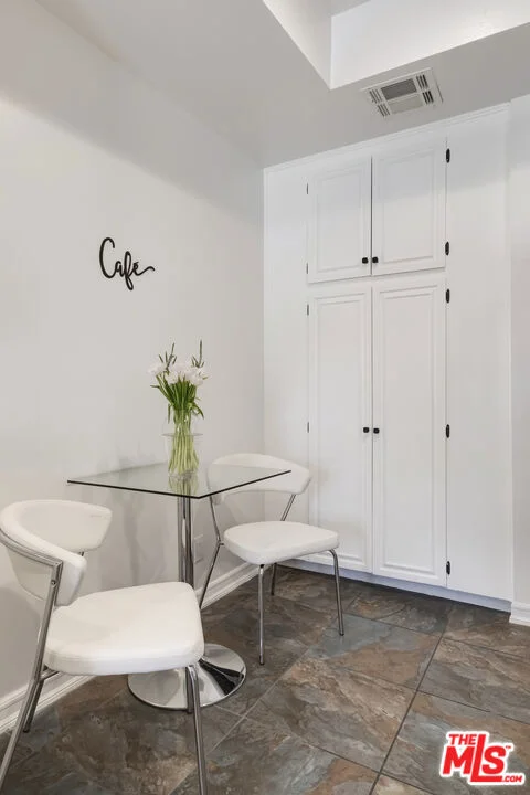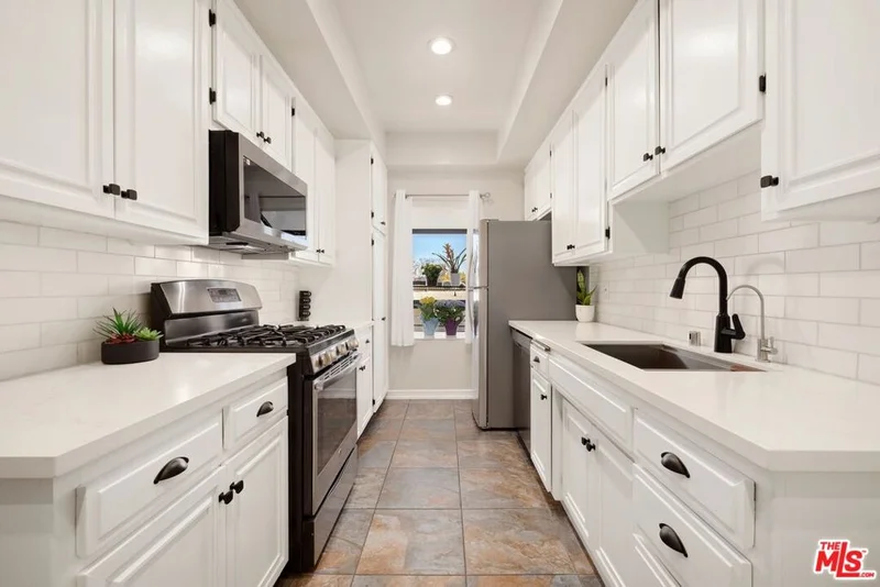 Tucked away in a quiet, rear-facing position in a secure building near South Beverly Hills, this beautifully upgraded residence in Pico-Robertson offers privacy, scale, and sophisticated living. An expansive formal entry introduces a refined interior featuring wide-plank luxury vinyl flooring with acoustic underlay, restored oak cabinetry, crown molding, and smart-home features including a DoorBird intercom, Ring doorbell, and mobile-accessible building cameras. The sunlit living room is anchored by a limestone fireplace with matte black accents and flows seamlessly into the dining area, which enjoys skyline and sunrise views. The chef's kitchen has been reimagined with quartz countertops, soft-close drawers, porcelain tile floors, top-tier appliances, a Ruvati sink with Moen faucet, water filtration system, and two oversized pantries including one large enough to accommodate a 48" refrigerator. A mirrored wet bar with matching finishes enhances the home's entertainment appeal. The primary suite spans over 400 square feet with two large walk-in closets and tranquil bamboo views. Its spa-like bath includes an 8-foot quartz vanity, Jacuzzi-style soaking tub, rainfall shower with new doors and hardware, matte black finishes, and extensive storage. The guest bedroom features custom built-ins and a full closet, while the adjacent bath offers a deep soaking tub, rain shower, and power flush toilet. Additional highlights include a fully serviced HVAC system, all new plumbing shut-off valves, rewired electrical, full-size washer and serviced dryer, and custom mini blinds throughout. The unit includes two non-tandem parking spaces one EV-compatible and convenient guest parking. Spectrum internet, hardwired Ethernet, and landline jacks are available. Set in a prime location with every detail considered, this residence blends comfort, technology, and classic design in one of LA's most desirable neighborhoods.