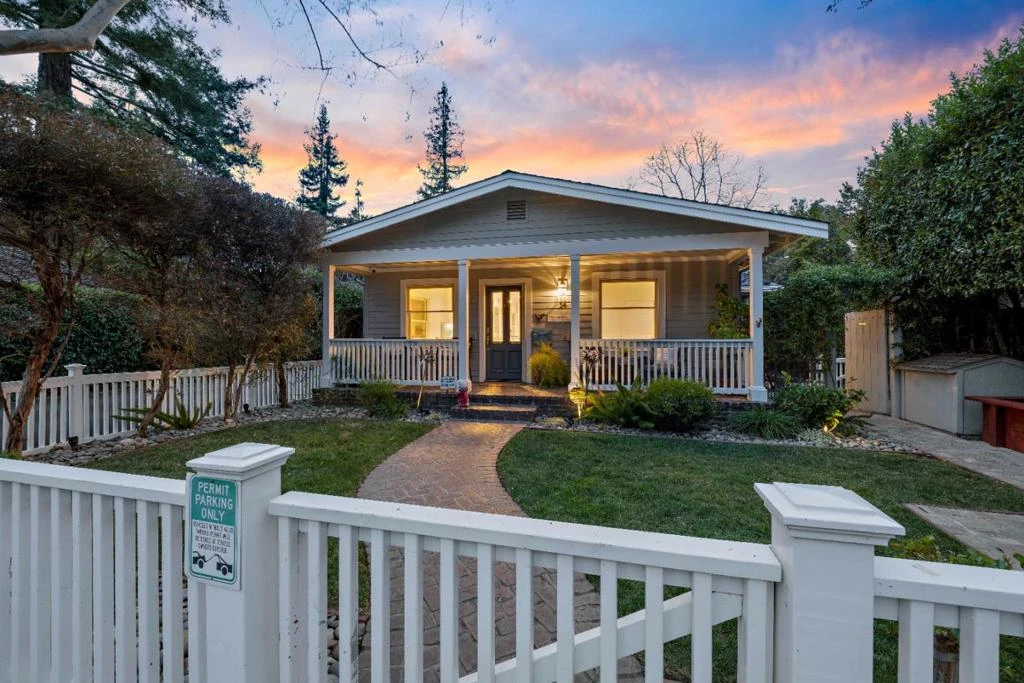 Rare single-story opportunity just moments from town! This charming 2BR/2BA home offers approx 1,252sf on a 3,600sf lot, plus a ~200sf casita. A winding brick pathway, classic picket fence, and expansive front porch create inviting curb appeal. Inside, the bright great room is ideal for everyday living and entertaining. The spacious kitchen features a breakfast bar, island, abundant cabinetry, and direct backyard access, with a convenient laundry closet. Beautifully refinished hardwood floors throughout. The secondary bedroom and hall bath are thoughtfully positioned for privacy. The expansive primary suite is a true retreat with a fireplace, walk-in closet, built-ins, recessed lighting, and private patio. The spa-like bath includes a stall shower, oversized jetted tub, dual vanities, and separate toilet room. Outdoor living shines with multiple paver patios, backyard TV sitting area, bistro lighting, vegetable planter boxes, and charming hidden dog house. The converted one-car garage offers a versatile detached casita with kitchenette, full bath, and laundry (without permits). Tons extra storage in casita attic. Close to downtown shops, dining, parks, and top-rated schools in a peaceful neighborhood setting. Electric vehicle charger and permit parking add to the convenience.