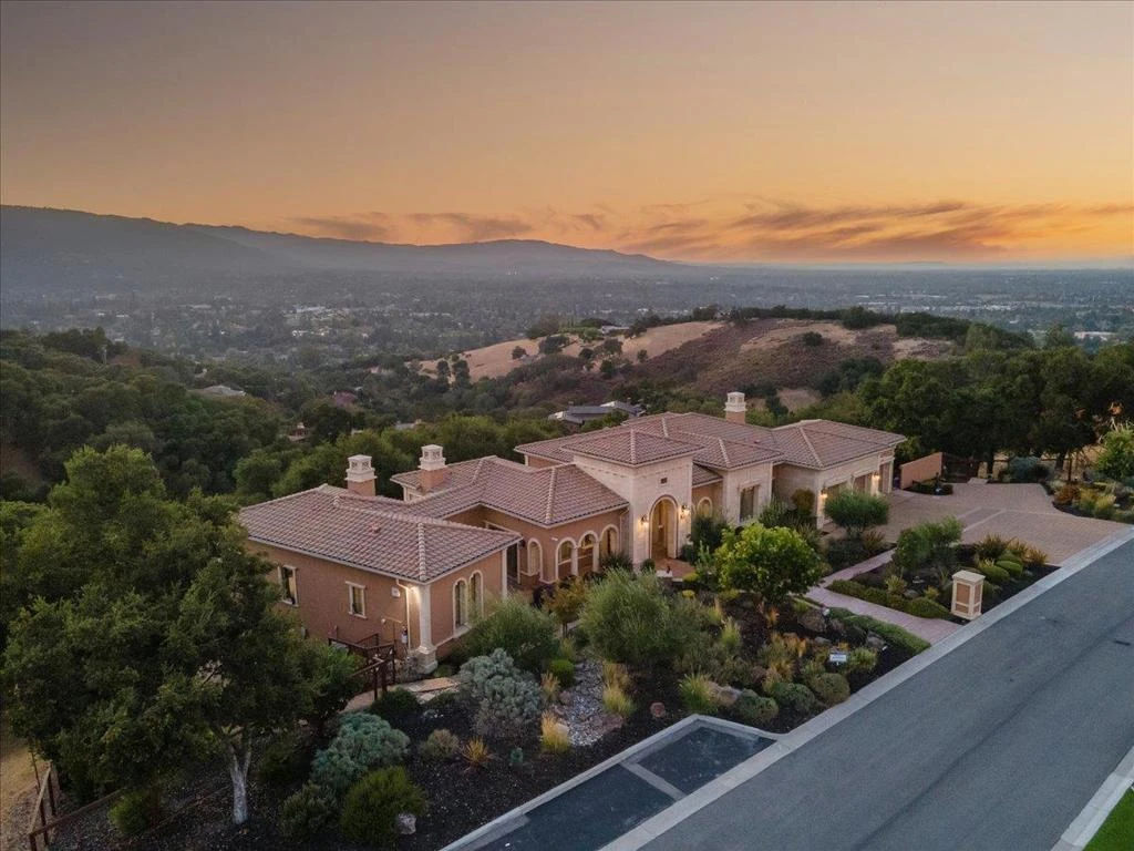 Magnificent Mediterranean Estate perched on 1.72 acre's in the Highlands Development with spectacular views of Los Gatos, Western Hill's, Mountain Winery, Cupertino Foothills, & East Bay. As you enter the wrought iron & glass doors you will find a formal entrance, formal dining room, formal living room with cast stone gas fireplace, box beam ceiling, Picture view window and french doors to exterior deck. There are 5 bedrooms with en-suite baths, 0ne 1/2 bath, including 2 large primary suites, one on each level. Spacious gourmet chef's kitchen with Thermador commercial grade appliances, 3 ovens, 6 burner gas cook-top, 2 dishwashers, wine fridge, warming drawer, and a huge center island. Attached family room with built-in cabinetry, box beam ceiling, built-in speakers, gas fireplace, and stack stone accent wall. Indoor laundry room with wash basin. Separate office with privacy glass doors. All bath surfaces are stone, granite, onyx, and travertine. Walk-in closets all with custom built-ins. Lower level Theater with screen and projector. Temperature controlled wine cellar with brick & wood beamed ceiling. Lower level game/media room with built-in speakers, 2nd butlers kitchen with rare Egyptian stone. Media rack, whole house Savant system, wood & stone floors. The list is endless!