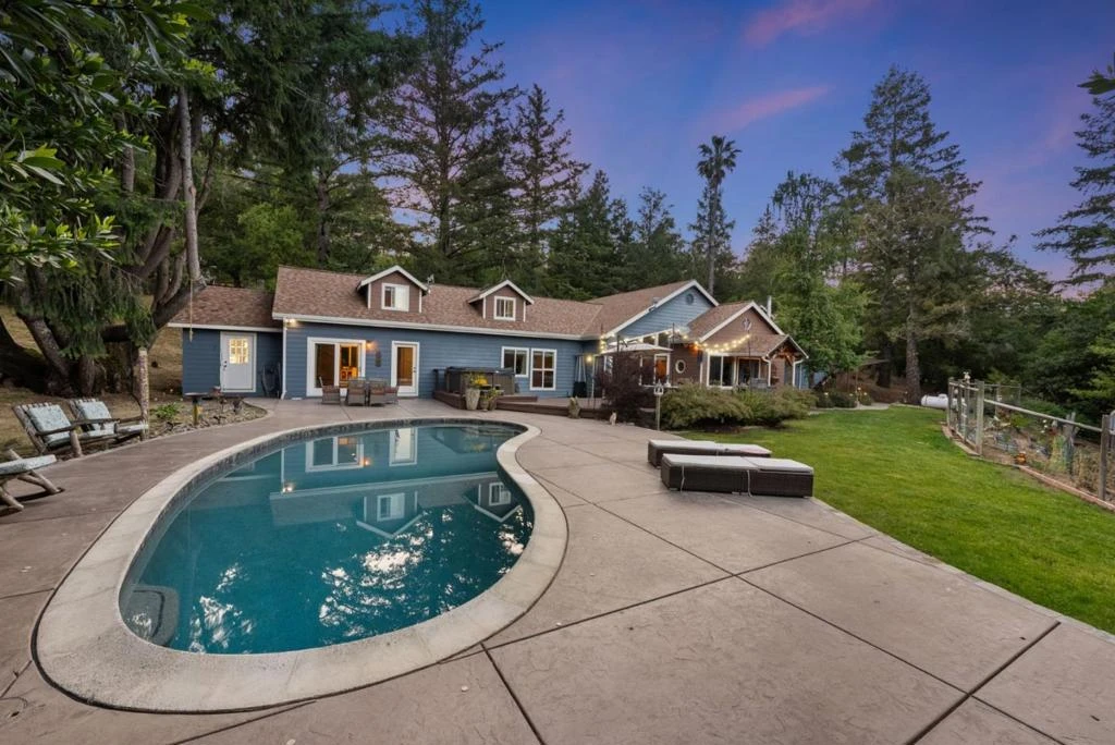 Welcome to 25560 Firhaven Lane - Your serene mountain retreat in the heart of the Los Gatos Mountains. This fully remodeled 5-bed, 3.5-bath home is perfectly situated at the end of a quiet cul-de-sac within a coveted Firewise community. Set on over an acre, the property blends modern upgrades with natural tranquility. Inside, the living room features vaulted ceilings, exposed beams, and a cozy wood-burning stove, creating a warm and inviting ambiance. The chef's kitchen boasts granite countertops, stainless steel appliances, and ample space for entertaining. The luxurious primary suite offers a spa-like en-suite bath, walk-in closet, and dedicated makeup area. Additional bedrooms are thoughtfully designed for comfort and functionality. Outside, enjoy a sparkling pool, hot tub, expansive deck for gatherings, and even a charming chicken coop. A whole-house generator, durable cement siding, newer roof, and a high producing private well ensure peace of mind. Located approx. 5 minutes from The Summit Store, 20 minutes from Downtown Los Gatos, and within the highly acclaimed Los Gatos school district, this home offers a perfect blend of mountain charm and modern convenience. A piece of paradise like this doesn't present itself often and now is your opportunity to make this your home!