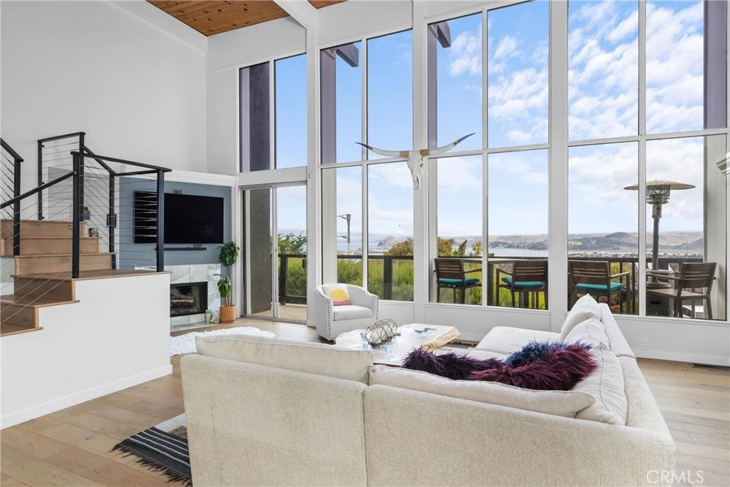Located in the prestigious neighborhood of Cabrillo Estates, this exceptional 2,976 sq/ft home offers breathtaking, panoramic views that stretch across the bay with its ever-changing tides, the sand dunes, Pacific Ocean, iconic Morro Rock, Hollister Peak, and the distant Santa Lucia Mountain Range. These views can be enjoyed from the living room, dining area, office, upstairs primary suite, and guest room. This 3-bedroom, 3.5-bath home also features a dedicated office and a main-level suite. With its own private entrance, this spacious suite includes a jacuzzi tub, separate shower, and a dual-sided fireplace connecting the bedroom and en suite bath—offering comfort, privacy, and income potential. The main living area showcases soaring vaulted ceilings and expansive windows that flood the space with natural light and perfectly frame the stunning surroundings. The kitchen features sleek quartz countertops and a long quartz breakfast bar—ideal for casual dining or morning coffee. The adjacent dining area includes built-in banquet seating, perfect for meals with a view. Nearby, a beautifully designed built-in bar features a keg tap, wine fridge, beverage fridge, and ice maker—an elegant and functional centerpiece, perfect for entertaining guests with ease. Upstairs, the luxurious primary suite is a true retreat where you can wake up to postcard-worthy views of the ocean, dunes, bay, and Morro Rock. The suite also includes a sauna, jacuzzi tub, separate shower, private water closet, and a walk-in closet that dreams are made of. Downstairs, a large bonus area offers flexible use as a media room, gym, studio, or guest quarters. Additional features include central air conditioning and owned solar for comfort, efficiency, and peace of mind. With its unmatched views, thoughtful layout, and coveted location, this is a rare opportunity to own in one of Los Osos’ most sought-after coastal communities.