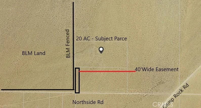 20 AC of quiet secluded land. Mostly flat, with a very slight upward slope to the NE. Excellent views for the valley and surrounding rock formation features. 160 AC parcel abutting on the west is recently fenced in BLM land, which adds privacy and seclusion. The main access road in Northside Rd, which runs East/West. The lot is accessed by recorded easement on the west 40 feet of the lot to the immediate south. The lot is rectangular in shape and is approximately 1/8 mile by 1/4 mile. Larger parcels such as this have a much wider land uses making this ideal for nearly any type of home or business operation. Jurisdiction for this property is the County of San Bernardino. ****NO STREET ADDRESS HAS BEEN ASSIGNED. Numerical is only a reference and is part of the APN****