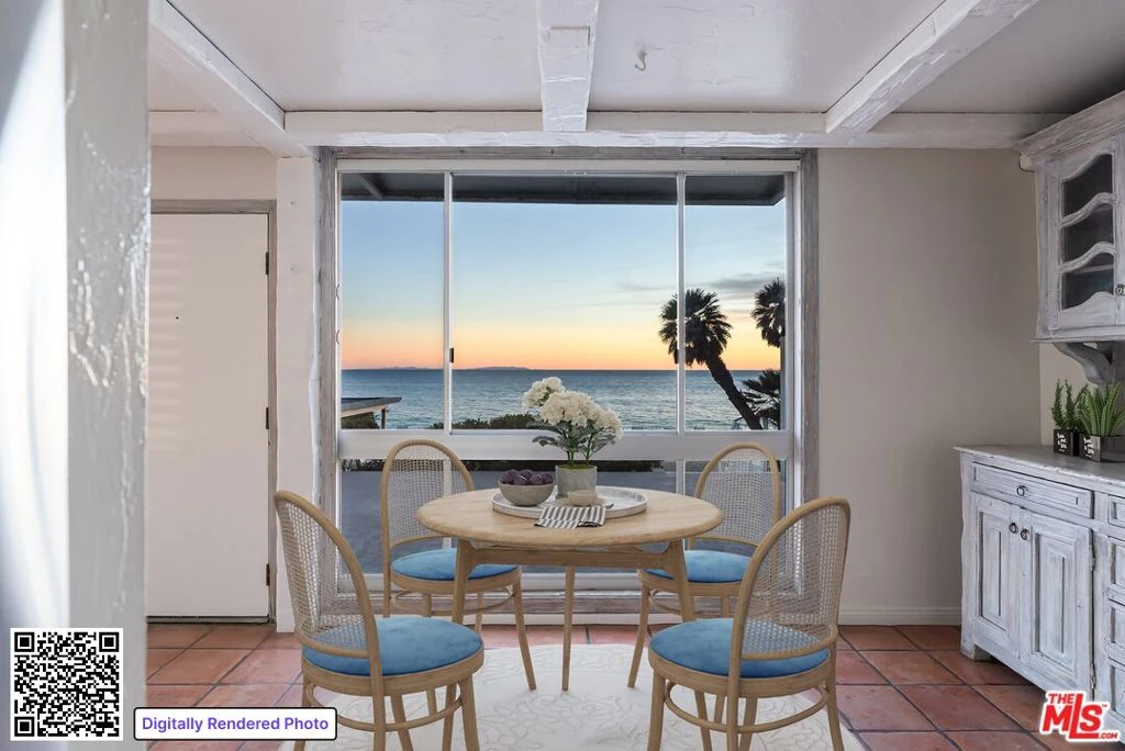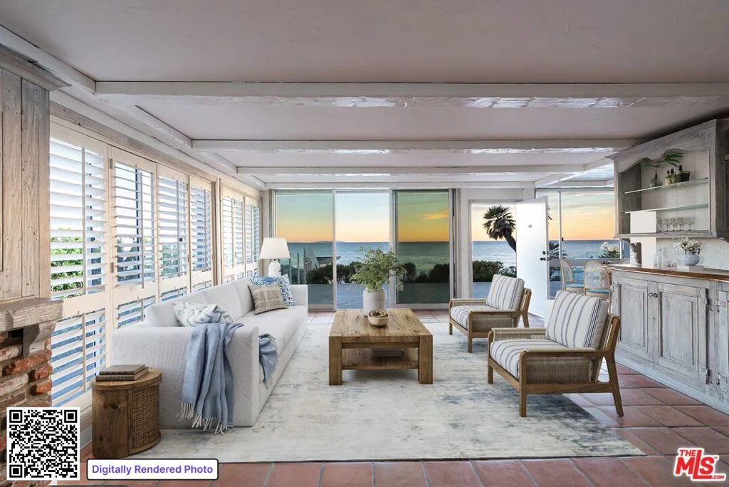 Set on Malibu's iconic Carbon Beach, this rare first-floor corner residence at the Malibu Outrigger captures the essence of refined coastal living. Steps from the private sandy beach and the Outrigger's oceanfront pool and spa, this sophisticated 2-bedroom, 2-bath retreat offers sweeping whitewater vistas from sunrise to the Queen's Necklace glowing at night. Inside, an updated, flexible floor plan blends relaxed elegance with warm, timeless finishes. The open kitchen and spacious dining area flow seamlessly into a living room anchored by a wood-burning fireplace, with distressed wood accents and artisan tile adding texture and character. Walls of glass extend the living space outward to an expansive, intimate patio perfect for morning coffee, sunset entertaining, or dining to the sound of the surf. The premier corner location enhances natural light and coastal breezes, creating an atmosphere of serenity throughout. From this coveted beachfront setting, stroll along the sand to Nobu, Soho House, the Malibu Pier, and the area's most celebrated restaurants. Offering private beach access, resort-style amenities, and an unbeatable Carbon Beach address, this residence presents an extraordinary opportunity to enjoy Malibu living at its most iconic. Property has been virtually staged.