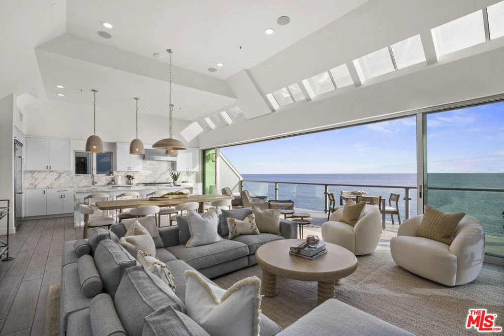 All rooms beach front in this completely and recently remodeled 3 bed/3.5 bath contemporary beach house nestled between a private road with loads of parking and one of the deepest, driest sections of sand in central Malibu. Exquisitely designed with one eye on form and the other on function, this already large home of nearly 3,000 sq ft. (not including the 2 car direct access garage) feels much larger in size, scale and volume due to the high ceilings with tons of natural light flooding the wide open spaces coupled with the 3 decks visible through large glass door systems one of which gives direct and private access to the sand. Complete with spa, heat lamps and outdoor seating perfect for large group dining or lounging. Walk for miles down the beach, surf the point out front, enjoy tide pools at low tide or just relax in this beautiful home.