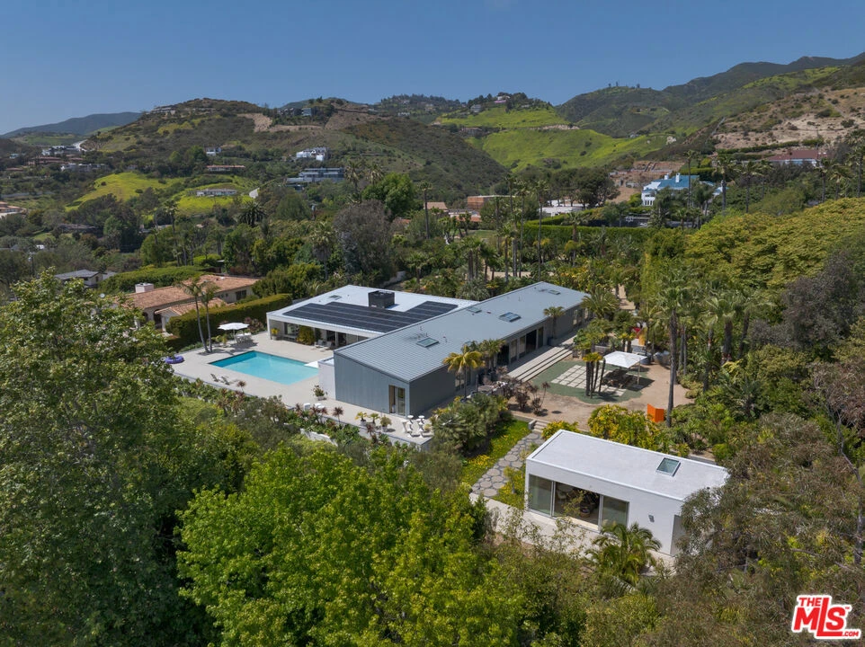 A refined modernist masterpiece, the Shed House has earned well-deserved recognition for its sleek mid-century Palm Springs aesthetic and its exceptional use of absolutely contemporary materials and design. Named for its gently-sloping roof line, the T-shaped residence sits gracefully on a gated parcel of over 1.2 acres at the end of a cul-de-sac on a private road, where it commands sweeping views of the ocean, Point Dume, and Paradise Cove. Custom designed by Michael Boyd and Laurel Broughton, the home was envisioned as a setting for art and sculpture, indoor-outdoor entertaining, and a lifestyle of tranquil comfort. The open layout provides an east-west entertainment axis with expansive, vaulted spaces and walls of glass opening to the pool deck for convivial gatherings, while assuring privacy to bedrooms located in separate wings. At the front of the house is a large circular drive, and an approach with beautiful tropical landscaping that features a quiet covered patio. The main living area is a gorgeous pool and ocean-view living-family-dining great room with high, custom-finished, parchment-glazed maple ceilings, wraparound walls of glass, and custom engineered and stained French oak wide-plank floorboards over a layer of cork for added quiet and comfort. A free-standing double-sided fireplace clad in shimmering, hand-made Heath Ceramic tiles faces the living room and the covered patio at the front of the house. Beneath a large skylight, the top-quality Miele custom kitchen expands from the spacious dining area, with a huge Carrara marble-topped island, generous counter space and custom cabinets, and a large storage pantry. In its own wing, the primary suite, complete with a walk-in closet, has soaring silver-gray stained maple ceilings and a wall of glass opening directly to the pool deck and patio. The dual-sided primary bath also has sliding glass doors to the backyard. On the opposite side of the home's entrance, another hallway leads to two serene en-suite bedrooms, one opening to the backyard, the other opening to a private terrace on the side of the house. The compound has two separate guest accommodations. A detached guest house, which could easily serve as a studio, gym, office, or theater, has a kitchenette and en-suite bath. A second guest house is attached to the garage, where it has a kitchenette and two bedrooms with separate entrances and a locking door between. The two-car garage, with a custom-built disappearing garage door, has laundry facilities, room for a golf cart, and abundant storage space.The ocean-view backyard features a pool with an artful water feature and expansive entertaining deck, a putting green, bocce court, a large dining and barbecue area, a nursery, and meandering pathway to scenic lounging areas surrounded by picturesque lighted and irrigated landscaping. Additional features include a wine cellar, two Tesla Power Walls, commercial grade anodized aluminum glass doors, security system, solar power, a Japanese cedar hot tub, Heath Ceramics in all baths, hidden floor-to-ceiling roller blinds, museum reveal floor trim, and deeded access to the beach and golf cart parking at Escondido Beach. A remarkable achievement in elegant simplicity and livable beauty. *18 month lease minimum*