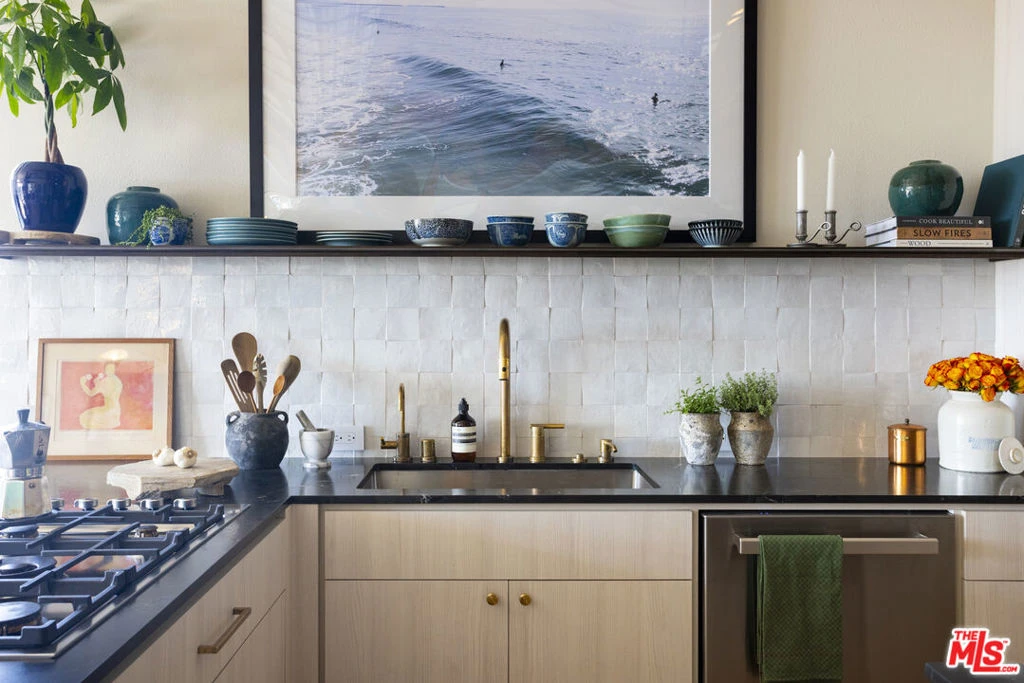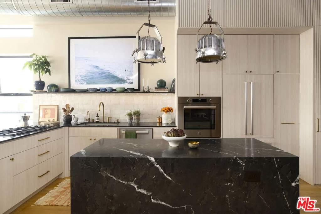 Welcome to this stunning 1,840 square foot North and West facing corner penthouse loft in the heart of the vibrant Del Rey Arts District. Extensively remodeled and thoughtfully designed to blend modern luxury with industrial loft character, this one-of-a-kind residence features soaring 17-foot ceilings and expansive windows that flood the space with natural light, creating an airy and dramatic living environment. Designed for both everyday living and effortless entertaining, the home boasts a private, sprawling terrace as well as a private roof deck providing multiple outdoor spaces to relax and enjoy your coffee or cocktail in the coastal breeze. A corner gas fireplace with a travertine and microcement surround anchors the living room, complementing the sultry vibe of this unique and curated retreat. The gorgeous entertainer's kitchen showcases dark quartzite countertops, floating steel shelving, custom cabinetry, and premium, integrated appliances. Both bathrooms have been beautifully renovated with custom marble countertops, elegant zellige tile and unlacquered premium brass fixtures, while a custom steel glass bedroom enclosure enhances the industrial aesthetic. The primary suite, with generous closet space and a spa-inspired shower is privately situated on the mezzanine level, overlooking the spacious living area below.Additional upgrades include a brand-new HVAC system, updated plumbing and electrical throughout with an upgraded panel, custom light fixtures, Nest thermostat and carbon monoxide detectors, and a Google video doorbell. Every detail has been considered. Located in a well-managed building, this unit is impeccably maintained featuring a brand-new shingle roof, recently recoated walkways and terraces, 2 parking spaces with electric car charging, and shared amenities such as a large rooftop lounge with panoramic sunset views. This Penthouse sits in a highly convenient neighborhood just minutes from Venice beach, Marina waterfront and Abbot Kinney dining- offering the best of the Westside lifestyle.