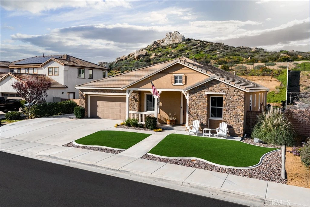 Welcome home to Wilderness Way, an elegantly designed single story residence offering 4 bedrooms, 3 baths, an office or optional 5th bedroom, paid solar, large quarter acre lot and no rear neighbors. This highly desirable Ranch Style property is situated in the premier community of Audie Murphy Ranch, in Menifee, sitting at the top of the community, just minutes from the Elementary school, Taawila. The meticulously maintained front yard features artificial turf, an extra wide driveway, a dual gated side yard for oversized parking of 10'x42', and a quaint porch with gorgeous views. As you enter the home you are greeted by 12' ceilings, high end flooring, recessed lighting, custom paint and desirable floor plan. Off the entrance is the office made private with a custom barn door. Across the wide hallway are two secondary bedrooms, featuring standard closets, plush carpet and ceiling fans. They share a secondary bath boasting a shower tub combo. The large laundry room is appointed with a custom butcher block counter featuring a sink and tons of storage with access to the 3-car tandem garage. The third secondary bedroom, a Junior Suite, is off the Great Room and offers a larger space with a walk-in closet and attached bath with a shower tub combo. The breathtaking Great Room features soaring 20-ft ceilings, quiet cool system, and an open concept layout designed for entertaining allowing large view windows to be the focal point of the home offering stunning views of the yard. This living area also features a gas fireplace and opportunity for built-ins flowing right into the dining area and gourmet kitchen. The Kitchen is appointed with granite counters, stainless steel appliances, walk-in pantry, glass tile backsplash and a built-in dry bar. The amazing dry bar is upgraded with a wood accent wall, quartz counters, wine fridge, and storage. The large Primary suite offers two walk-in closets and attached bath with a soaking tub and walk-in shower. The extremely private yard boasts stamped concrete, aluma wood patio cover, artificial turf, tons of greenery, wine vines, a removable pergola over a concrete pad for entertaining, and shed. The community amenities include pools, spa, sports courts, skate park, club house, meeting and banquet rooms, hiking and biking trails, gym trail, and the new Kathryn Newport Middle school. The home is located between the 15 and 215 freeways, tons of shopping including Sprouts, Barons, Target and is next to the Menifee pump track.