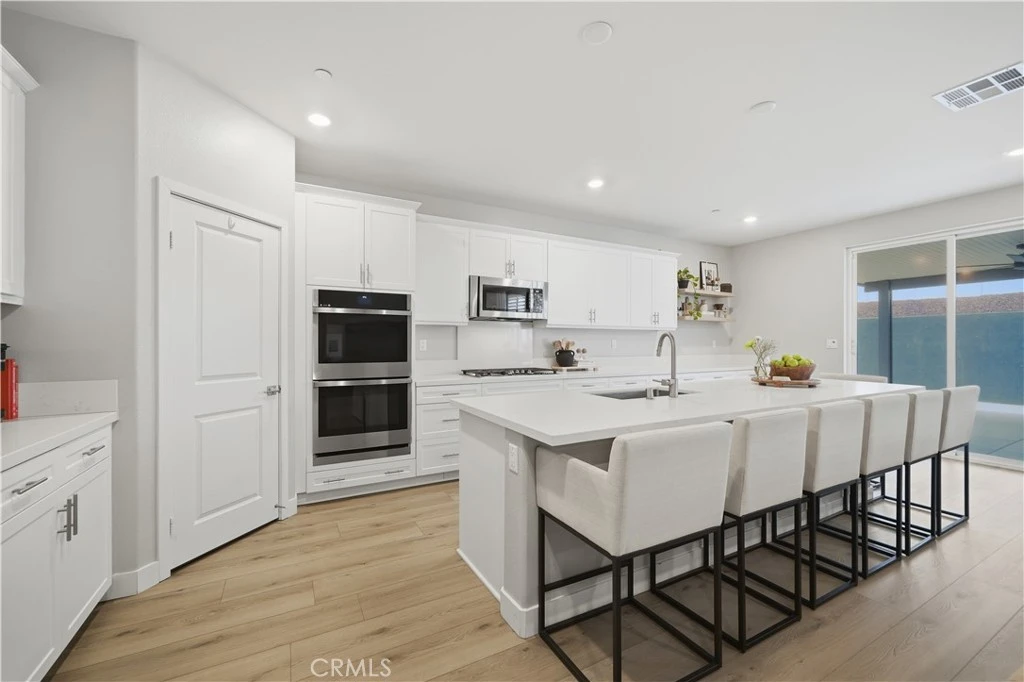 PAID SOLAR, Multi-Generational Living and a Beautifully Upgraded Model—Welcome to the desirable Quartz Ranch community! This stunning home features 4 bedrooms plus an optional 5th, 3.5 bathrooms, an upgraded kitchen, and an entertainer’s backyard complete with a custom bar and dog run. The open-concept design is filled with natural light and showcases an oversized island, quartz countertops, luxury flooring, and shutters. The thoughtfully designed layout includes a private bedroom and bathroom in its own wing—ideal for extended family or guests—Check out the versatile flex room perfect for an office or game room. Exterior features include a covered patio for seamless indoor-outdoor living, finished concrete, a built-in sports bar, and a spacious dog run. Turf in both the front and back yards provides a low-maintenance, water-efficient lifestyle. Ideally located near parks, schools, shopping, dining, and major commuter routes, this home offers the perfect blend of comfort, style, and functionality.