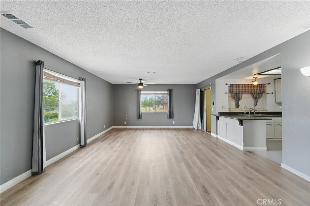 Welcome to this beautiful 3-bedroom, 2-bathroom home with a 2-car garage, nestled in a peaceful Menifee neighborhood. The property opens onto a charming courtyard entry, complete with a soothing waterfall fountain. Step inside to an open, sun-filled floor plan with large windows that capture the natural light and offer scenic views of the surrounding hills. The spacious family room features a cozy fireplace, perfect for relaxing evenings, and flows seamlessly into the formal dining area, ideal for entertaining. The kitchen opens to the dining space, creating a warm and welcoming layout for family gatherings. A sliding glass door, located just off the kitchen, leads to an enclosed den with a closet providing additional storage space. The large backyard offers ample space to relax, play, or create your ideal outdoor oasis. The primary bedroom has a walk-in closet and a private bathroom. Two additional bedrooms and a full bathroom in the hallway complete the home. Conveniently located near community parks, playgrounds, and shopping, dining, and just minutes from the 215 freeway. NO HOA makes this home even more appealing. Enjoy peaceful living with beautiful hill views—schedule your private tour today!