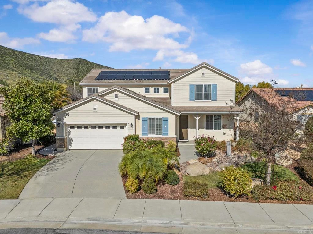 Welcome to this beautifully upgraded former Lennar model home, showcasing premium features and thoughtful design throughout with elegant crown molding, recessed lighting, stylish blonde wood-look tile flooring downstairs, Berber carpet upstairs complemented by a smart thermostat, smart lock, and a central sound system House is equipped with energy efficiency including a leased solar system to help cut down your electric bills and a QuietCool whole-house fan, helping maintain comfort while reducing energy costs. The highly desirable floor plan features a bedroom and full bathroom on the main floor, perfect for guests or multi-generational living. There is also a dedicated office with beautiful built-in bookshelves and a spacious formal dining room ideal for hosting parties and family gatherings. The oversized kitchen is the heart of the home, offering a large granite island, tile backsplash, double ovens, large refrigerator space, abundant counter space and cabinetry, plus a separate walk-in pantry room. The kitchen opens seamlessly to the family room, complete with a stone fireplace, built-in shelving, creating the perfect setting for entertaining or relaxing with family activities or family gatherings. Step outside to a large, low-maintenance backyard with fruit trees and flowering plants, perfect for hosting parties with new upgrades including covered patio that spans the length of the home, new retaining walls, and ample room to add a future pool. Excellent privacy makes this outdoor space even more enjoyable. Upstairs offers an expansive loft, offering endless possibilities—game room, family lounge, media space, or additional office. The spacious Master bedroom features an elegant primary bathroom with dual sinks, soaking tub, separate shower, and a generous size walk-in closet. In addition, there are three more bedrooms, one with its own walk-in closet, plus a shared full bathroom with double-sink vanity. The laundry room with generous storage space is also located upstairs for added convenience. The tandem garage provides parking for up to four small-to-medium vehicles with additional storage space PLUS 4 overhead hanging storage racks and a deluxe epoxy flooring throughout. Another bonus is the newer water softener system. Situated on a quiet cul-de-sac, the home offers extra parking and added privacy while remaining conveniently located near the 215 freeway, shopping centers, restaurants, parks, and schools, including Mt. San Jacinto College. The community also features a low HOA fee. This home is a must-see!