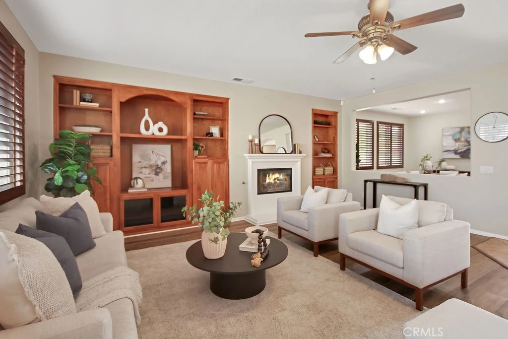 Move right in to this spacious 4-bedroom, 3-bathroom residence which offers 2,916 square feet of well-designed living space and a highly functional floor plan. Built in 2004, the home features a durable tile roof and attractive curb appeal with mature landscaping on a corner lot. Inside, the home opens to a welcoming entry with arched passageways with luxury vinyl plank wood flooring and tile throughout the main level. The interior is enhanced by wood plantation shutters and recessed lighting, creating a bright yet warm atmosphere. Multiple living and dining areas provide flexibility for entertaining, remote work, or multi-generational living. The open-concept kitchen features granite countertops, abundant cabinetry, walk-in pantry, a stainless steel kitchen sink, and a center island that flows seamlessly into the family room. Built-in cabinetry in the living room adds both function and character. A bedroom and full bathroom on the main level offer convenience for guests or extended family. Upstairs, Pergo flooring extends through the second level, including the expansive primary suite. The primary bathroom features mosaic tile and travertine flooring, dual vanities, a soaking tub, and a separate shower. The backyard offers a private outdoor setting highlighted by fruit trees and a wood-burning firepit, ideal for gatherings or quiet evenings. Additional features include a dedicated laundry room and a three-car garage with epoxy flooring. Conveniently located near schools, parks, shopping, and commuter access, this home offers comfort, space, and thoughtful upgrades throughout.