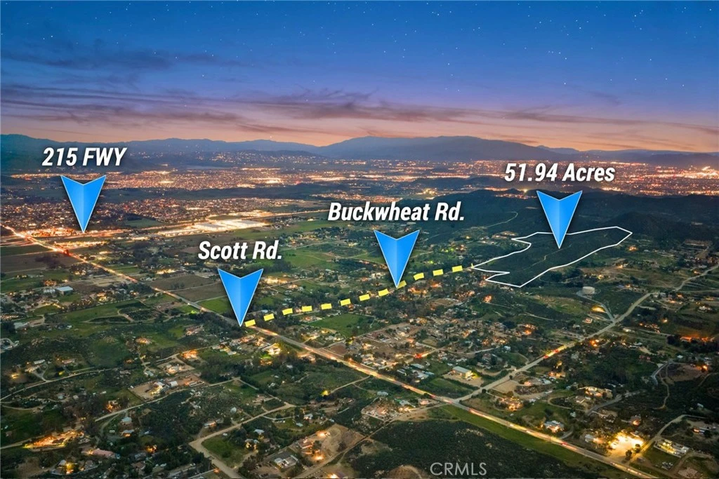 Directions : Use 33795 Buckwheat Rd. Menifee on GPS to get to back gate. 52 Acres of Prime Scenic Land / Menifee/Murrieta Border Welcome to Chaparral Hills, an exceptional land offering – 52+- acres of spacious and secluded rolling, view-filled terrain conveniently positioned between the I-15 and I-215 freeways, just south of Scott Road. This property on the Menifee/Murrieta boundary offers the best of both communities with nearby shopping and dining. Zoned R-A-2 ½, the property provides multiple potential building sites for a luxury estate home and equestrian facility with sweeping panoramic views in multiple directions amidst seclusion and open vistas. The scenery here is breathtaking with views of multiple mountain ranges in the distance. The holding is alternately a long-term investment opportunity in the rapidly growing Menifee area. The property benefits from existing public roads that lead directly to the parcel, underground utilities in the adjoining custom home development and several existing water meters and fire hydrants already in place. This opportunity provides unmatched space, accessibility and natural beauty. Buyer to verify lot size, zoning and property uses.