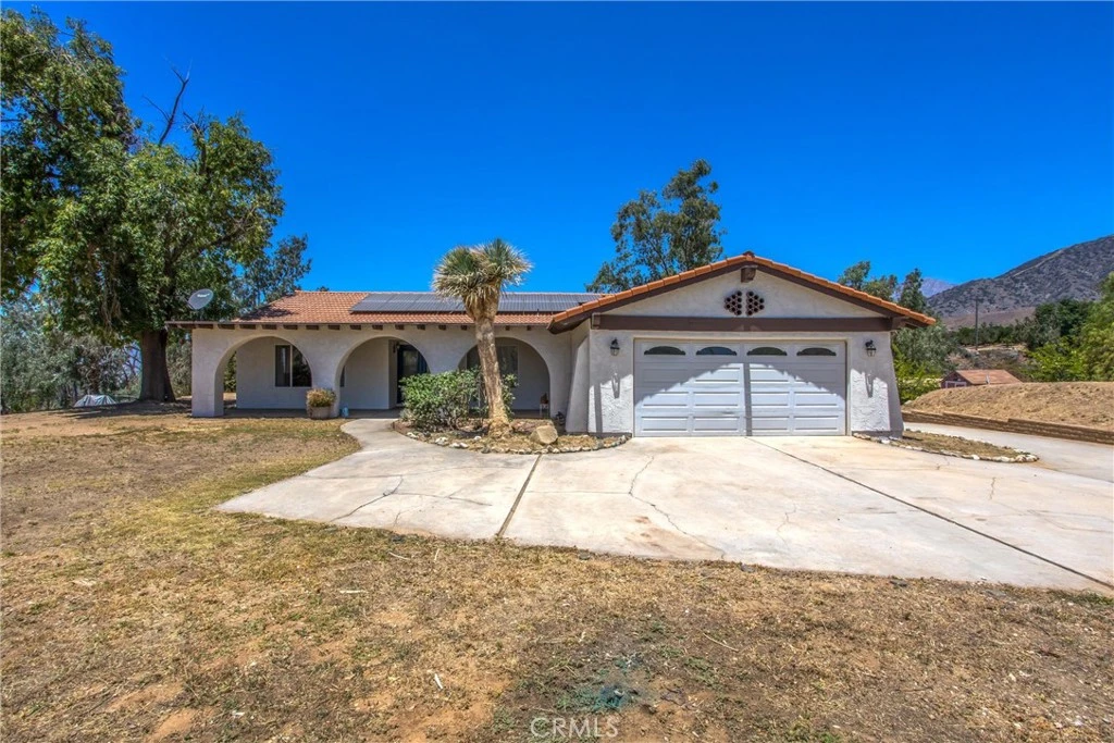 Discover the perfect blend of rural charm, open space, and modern comfort in this beautifully maintained Spanish-style ranch home, set on five fully fenced acres with breathtaking mountain views. Whether you are an equestrian enthusiast, nature lover, or simply seeking tranquility, this property offers a lifestyle rooted in peace, potential, and outdoor living. This bright and spacious single-story home features tile flooring throughout, ceiling fans in every room, and fresh interior and exterior paint. The inviting double front doors and three sets of French doors open to peaceful outdoor spaces that are ideal for entertaining or enjoying quiet mornings with nature. The home is all-electric and includes owned solar panels with a new inverter installed in 2023, helping reduce utility costs. For added comfort and value, the AC and furnace system and septic system were both replaced approximately two and a half years ago. An owned water filtration and reverse osmosis system, installed in 2023, provides clean, high-quality water throughout the home. Equestrian and outdoor enthusiasts will appreciate the horse shelter, wide-open views, and abundant space for horseback riding, hiking, dirt biking, or simply enjoying the outdoors. While not all of the land is level, there is plenty of usable space with a drip irrigation system for trees and access to a sprinkler system for expanded landscaping. The attached garage provides convenient direct access to the home. Located just a short drive from Redlands and Highland, this property offers a quiet rural lifestyle with city conveniences nearby. Additional features include a tile roof, a newer stove and dishwasher, and endless potential for personalization. If you are seeking a spacious horse property with modern upgrades and natural beauty, this is one you will not want to miss.