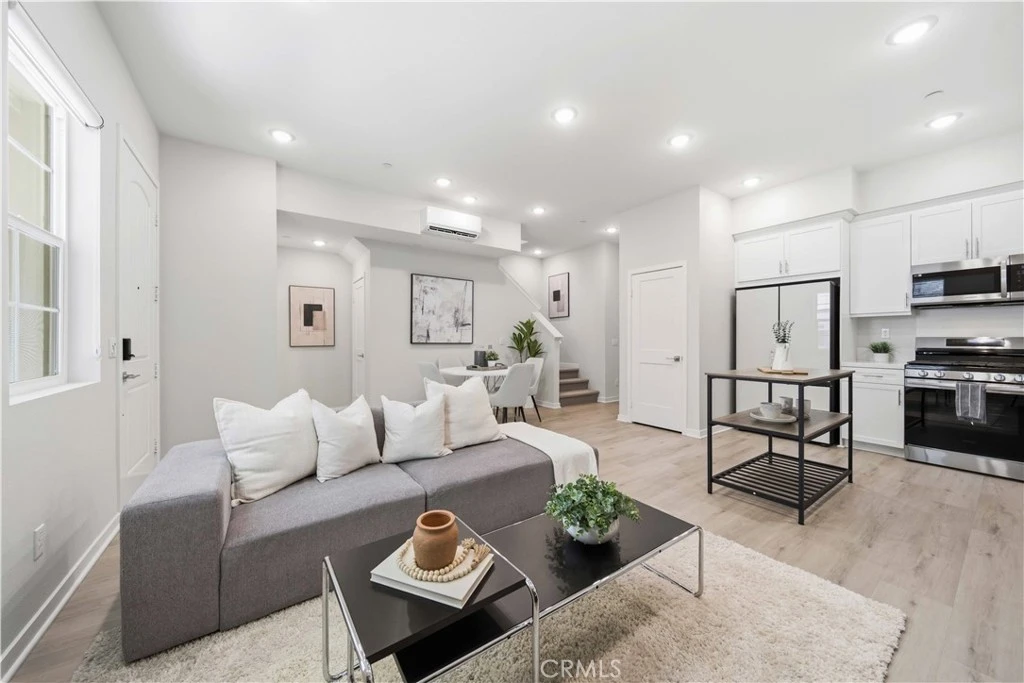 Welcome to 105 Lugo in Mission Viejo, a beautifully maintained, newer construction home built just about two years ago and proudly owned by its original owner. Located in the desirable Saddleback Place community by Trumark Homes, this modern residence offers the perfect blend of contemporary design, energy efficiency, and low-maintenance living. With approximately 887 square feet of thoughtfully designed space, the open-concept floor plan feels bright and spacious, enhanced by oversized dual-pane windows that fill the home with natural light. The main living area features wood-look luxury vinyl flooring, recessed lighting, and custom window treatments, creating a clean, sophisticated look. The kitchen is both stylish and functional, complete with stainless steel appliances, sleek countertops, white cabinetry, and seamless flow into the living and dining areas—ideal for everyday living and entertaining. Upstairs, plush upgraded Berber carpeting lines the staircase, hallway, and primary bedroom, adding warmth and comfort. The spacious primary suite is highlighted by dramatic 13-foot ceilings, creating an airy retreat with an open, light-filled ambiance. Built with today’s efficiency standards in mind, the home includes owned solar panels and a tankless water heater, offering long-term energy savings. An oversized one-car garage plus an additional dedicated parking space provide added convenience. Residents enjoy access to the community pool, spa, and BBQ area, perfect for relaxing or gathering with friends. Conveniently located near the 241 Toll Road, major freeways, shopping, and dining, this home delivers modern comfort in a highly desirable Mission Viejo location. 105 Lugo is a rare opportunity to own a nearly new, original-owner home that has been meticulously cared for from day one.