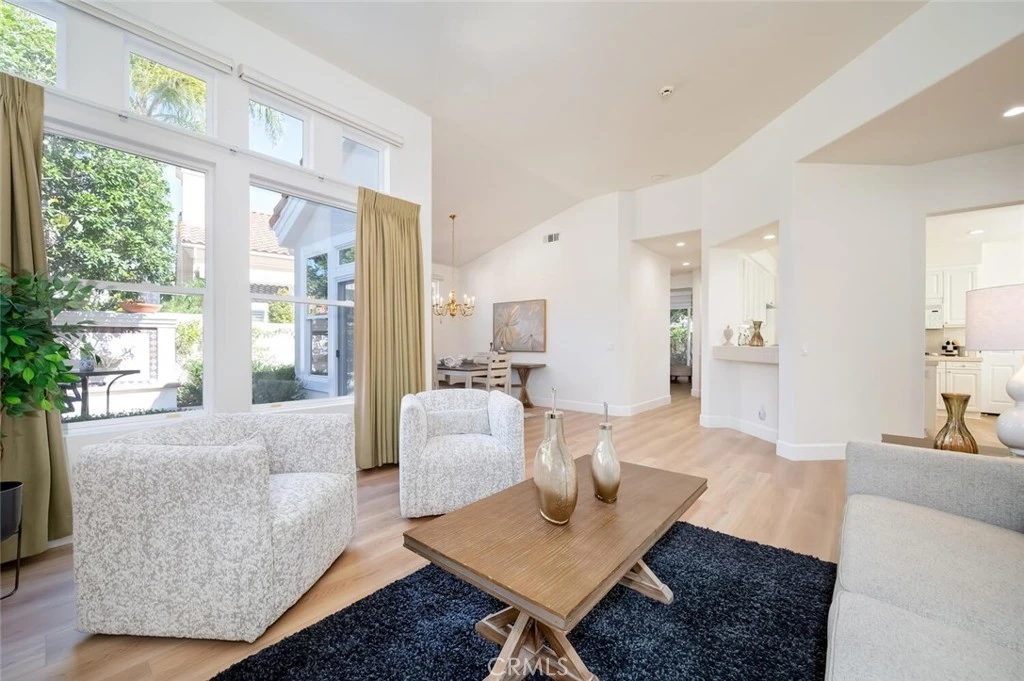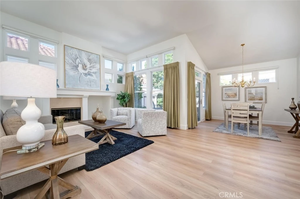 Wonderful Single Level home ideally situated on a larger, cul-de-sac within the highly desirable 55+ community of Palmia in Mission Viejo. Designed with comfort, ease, and active living in mind, this thoughtfully planned residence offers Two bedrooms plus a versatile Den and Two Full Bathrooms, all on one convenient level. From the moment you enter, you’re greeted by soaring ceilings and expansive windows that fill the home with natural light, creating an open and welcoming atmosphere. The seamless flow between the Living room, Dining room, and kitchen provides an ideal setting for both relaxed daily living and hosting friends and family. A cozy fireplace adds warmth and charm, enhancing the inviting feel of the main living space. The spacious kitchen features white cabinetry, with several pull-out shelves, a gas cooktop, and a center island, offering both functionality and style for those who enjoy cooking and gathering. The Kitchen also encompasses a dining nook. The Primary Suite serves as a peaceful retreat with an ensuite bath that includes dual vanities, a walk-in closet, and ample storage. A Secondary Bedroom, and nearby full bath provide comfortable accommodations for visiting guests, while the dedicated Den offers flexibility for a home workspace, hobby room, or quiet reading area. Recent improvements include a new Air Conditioning system, new luxury vinyl flooring and oversized baseboards, fresh interior and exterior paint, and new recessed lighting, providing modern comfort and move-in-ready appeal. Window treatments feature blinds and full draperies with blackout panels. Step outside to a beautifully designed wraparound yard that blends hardscape and softscape for low-maintenance enjoyment and privacy. This home was a former Model and presents itself on a larger cul-de-sac street nearby the Clubhouse and all the wonderful Palmia amenities. Residents of Palmia enjoy a vibrant, resort-style lifestyle with access to a clubhouse, pool and spa, fitness center, tennis and pickleball courts, putting green, library, bocce ball, shuffleboard, and a full calendar of social activities tailored to active adults. Homeownership also includes membership in Lake Mission Viejo, where residents may enjoy boating, lakeside beaches, summer concerts, and year-round community events. Conveniently located near shopping, dining, and everyday amenities, this home offers the perfect blend of comfort, community, and active living. Welcome home.