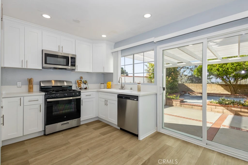 Welcome to this beautifully updated 4-bedroom, 2-bath home in the sought-after Barcelona community of Mission Viejo. Featuring a bright open floor plan, new downstairs flooring, all-new window coverings, and new sliding glass doors, this home is designed for seamless indoor-outdoor living. The brand-new kitchen offers new cabinetry, countertops, and appliances, making it the true heart of the home. A main-floor bedroom and full bath provide ideal flexibility for guests, multigenerational living, or a home office. Upstairs, the primary suite includes a private balcony, walk-in closet, and updated en-suite bath with peaceful treetop views. Two additional bedrooms—including a loft-style room—add versatility. The private backyard features mature Brazilian cherry trees, a fruit-bearing mango tree, and brick privacy walls. Additional upgrades include an energy-efficient reflective roof (2020), fresh interior paint (2025), newer carpet (2022), updated garage, newer water heater, gutters, and a newer front door. Enjoy exclusive access to Lake Mission Viejo with kayaking, swimming, concerts, and more. No Mello-Roos, no in-tract HOA, low tax rate, and lake membership. Move-in ready and priced to sell.