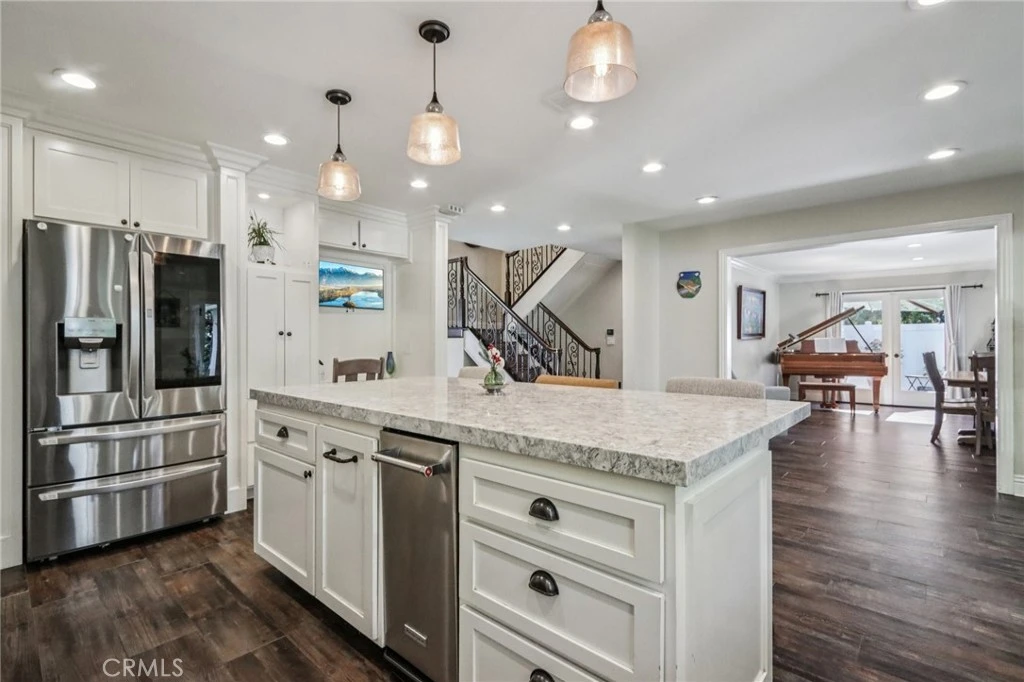 Welcome to this beautifully upgraded Mission Viejo home offering impressive curb appeal and exceptional indoor-outdoor living. Inside, the upgraded kitchen features white cabinetry, quartz countertops, a glass tile backsplash, a center island with breakfast bar, and stainless steel appliances—perfectly designed for both everyday living and entertaining. Wood-like tile flooring, recessed lighting, and custom built-ins enhance the home’s stylish and functional interior. The expansive great room is truly the heart of the home, offering an impressive amount of space, a cozy fireplace, and a sliding door that opens to a side patio area. A highly desirable main floor bedroom and full bathroom provide flexible living options for guests, multi-generational living, or a home office. Upstairs, an elegant iron staircase leads to three spacious bedrooms. The full hall bathroom creates a convenient and versatile layout. Step outside to an entertainer’s dream backyard. The custom paver hardscape begins with an expansive covered patio large enough for multiple seating areas. The spacious turf lawn provides plenty of room for recreation, while a gravel/sand strip is perfect for yard games. A wraparound seating area seamlessly connects the outdoor space back to the great room, creating the ultimate setting for gatherings and relaxation. Enjoy access to Lake Mission Viejo amenities, including beaches, boating, concerts, and year-round activities, making this home the perfect blend of comfort, style, and the sought-after Mission Viejo lifestyle.