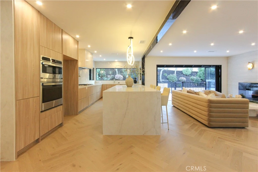 Rarely does a home come along that inspires the senses and elevates perceptions of what modern living can be. This is not simply a renovation — it is a complete re-imagination of lifestyle, executed with intention and precision. Designed with rigorous engineering plans and permits, this transformation stands confidently in a category all of its own. From the moment you arrive, curated landscape lighting guide you through sculpted grounds. Clean architectural lines and a majestic illuminated cactus create a setting that feels both organic and iconic. The arrival alone sets the tone: this is luxury resort living at home. Inside, stunning herringbone wood floors anchor the space in warmth and craftsmanship. A dramatic floating fireplace wrapped in striking stone serves as a sculptural focal point, reinforcing the home’s architectural presence. At the center, a spectacular kitchen unfolds around an expansive 10+ foot island — a true architectural statement designed to evoke connection. European-style frameless cabinetry, Miele gas cooktop, and refined finishes create a space equally suited for elevated entertaining and everyday life. Multiple expansive folding patio doors blur the boundary between indoors and out, opening to a private backyard retreat complete with pool and lush lit landscape. The result is seamless California living - elevated. Offering 4 bedrooms and 4 full bathrooms, plus a generously sized flex space ideal for a bonus room, office, media lounge, or potential fifth bedroom, the layout adapts as life evolves. Over 8200 sqft lot, this permitted renovation added an additional bedroom and full bath, indoor laundry, and reimagined the plan for openness, functionality, and modern flow. The primary spa-inspired bathroom rivals luxury resorts with opulent design, warm wood accents, curated lighting, massage sprays, and a recessed rain shower. Every detail — from smooth drywall to precise mitered edges — quietly communicates quality. Solid white oak fluted interior and exterior doors, vast contemporary stonework, upgraded plumbing and electrical systems with new panel, and a sleek black glass and aluminum garage door reflect just a touch more of the many upgrades that will please. Reminiscent of custom homes in premiere OC communities like Newport and Laguna Beach, this residence delivers an elevated and opulent lifestyle within reach. Lavish yet livable. Refined yet welcoming. This is more than a home. It is a experience. It's your next chapter.