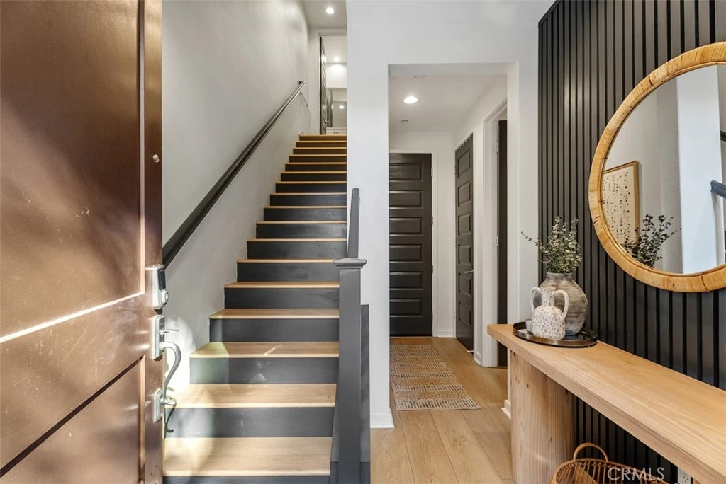 Stunning newly built home features 4 spacious bedrooms and 4 bathrooms, including a desirable main-floor bedroom with custom barn door, an upgraded en-suite bath featuring quartz counters and a walk-in shower. This main floor bedroom is perfect for someone wanting a home business area. The first level also offers a spacious 2-car garage with direct access, epoxy floors, built-in storage, an EV charging plug, tankless water heater and water softener system. The second level is an entertainer’s dream with a bright, open-concept layout showcasing high ceilings, recessed lighting, 6 speaker surround sound, beautiful luxury vinyl flooring, and abundant natural light. The chef-inspired kitchen features a large quartz island, stainless steel appliances, white soft-close cabinetry, and a pantry. The living area flows seamlessly to a private balcony, perfect for alfresco dining or relaxing outdoors. Upstairs, the spacious primary suite offers a peaceful retreat with a walk-in closet and a luxurious bathroom featuring dual vanities, quartz counters, upgraded cabinetry, and a walk-in shower. Two additional bedrooms share an upgraded bathroom with a tub/shower combination. This home has custom built-ins and upgraded features throughout including a cute dog house area. Enjoy resort-style HOA amenities including a sparkling pool, spa, playgrounds, and BBQ dining areas. Ideally located near top-rated schools, shopping, dining, and the 241 toll road. Outdoor enthusiasts will love the close proximity to O’Neill Regional Park and Whiting Ranch Wilderness Park. No Mello-Roos, low 1.02 taxes, and a low HOA make this an exceptional place to call home!