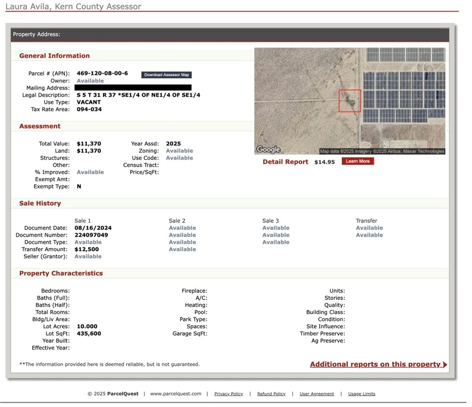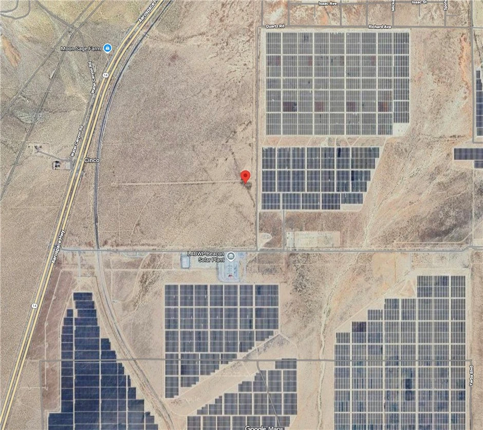 Opportunity to acquire a 10-acre vacant land parcel located in Kern County, positioned east of Highway 14 (Aerospace Highway) and immediately adjacent to the LADWP Beacon Solar Plant. The property consists of one contiguous, rectangular parcel situated in an area characterized by open desert land and established utility-scale solar development. The parcel offers flat terrain, wide open surroundings, and proximity to existing renewable-energy infrastructure, making it well-suited for land banking or long-term investment. Access is available via existing unpaved service roads connecting to the surrounding road network. No residential improvements are present. Conveniently located with relatively close proximity to Highway 14, the property provides regional connectivity while maintaining privacy and open space. Buyer to verify zoning, land use, utilities, access, and any potential development requirements with the County.